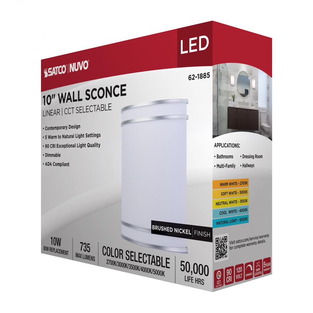 The SATCO NUVO 62-1885 Glamour Wall Sconce in Brushed Nickel delivers sleek, modern lighting with 5 CCT selectable technology (2700K–5000K) and 90 CRI illumination for vibrant color rendering. This 10-watt fixture replaces 80W incandescent lighting, prov