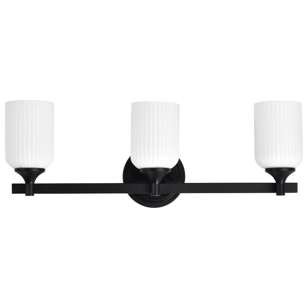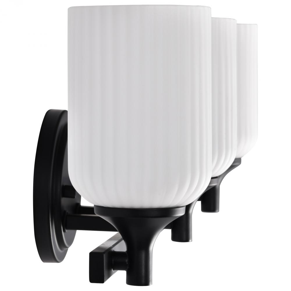 Solara; 3 Light Vanity; Matte Black Finish; Frosted Ribbed Glass