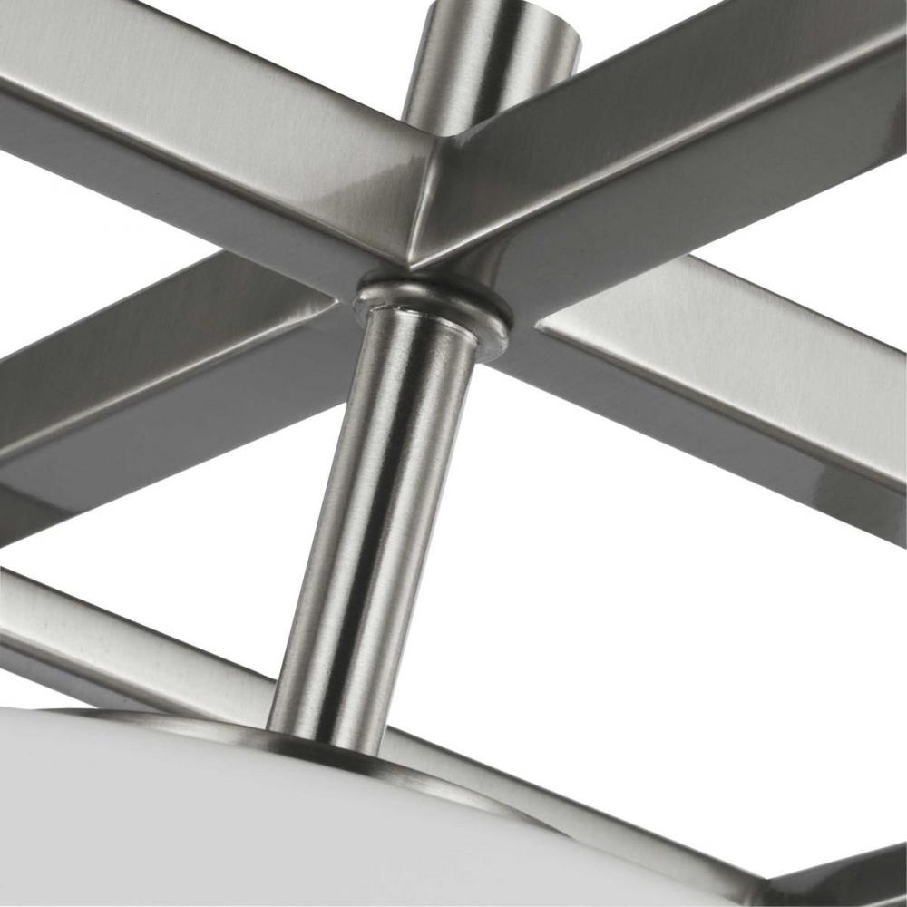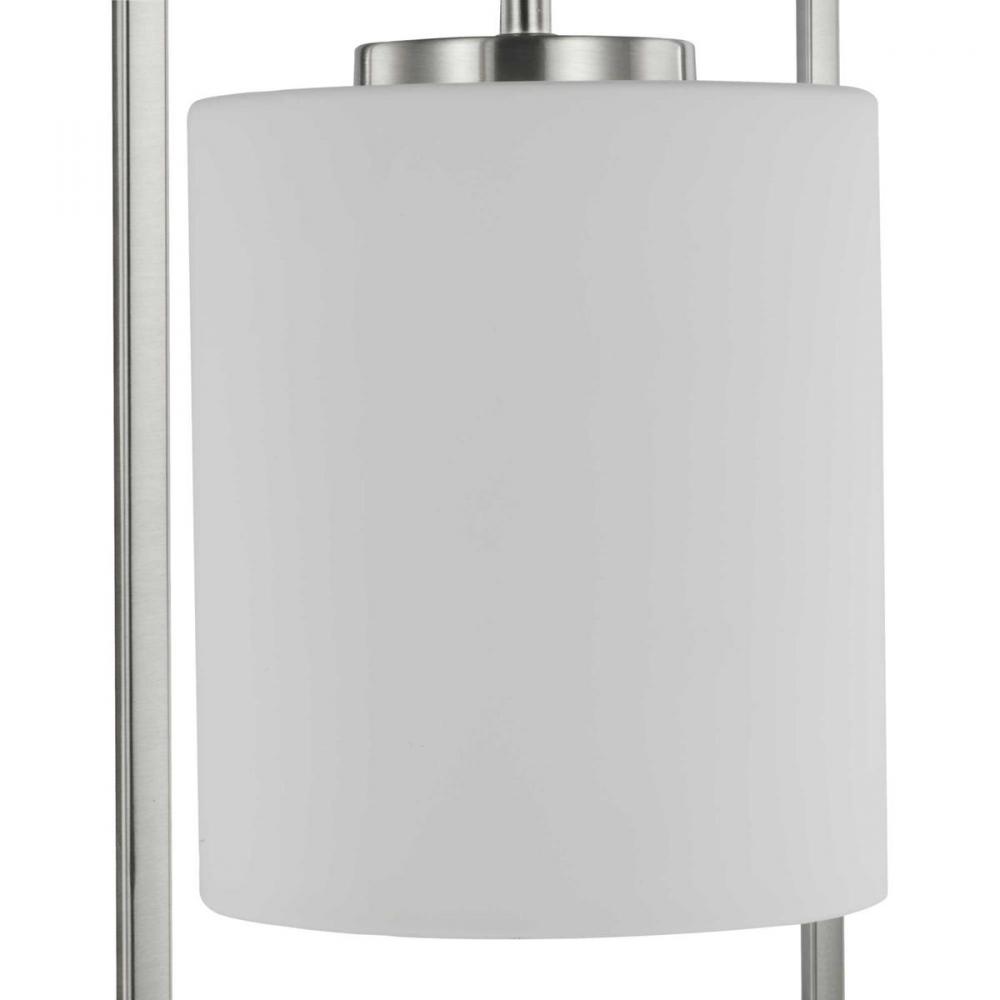 A beautiful opal glass shade visually calms the sharp edges of the boxy frame in a masterful stroke of design excellence.;The frame is coated in a classic brushed nickel finish that contrasts the light shade.;The light fixtures is just right for spaces in
