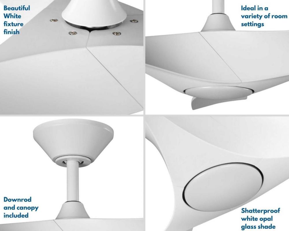 Enjoy a beautiful ceiling fan at a fantastic price with the Ryne Collection 52-Inch 3-Blade Matte White LED Transitional Indoor/Outdoor Ceiling Fan. Three slightly curved ABS blades are coated in a crisp matte white finish that will complement a variety of living areas. The blades are resistant to warping from environmental conditions and offer a long product lifespan. The fan's downrod and canopy are coated in a white finish to complete the transitional design. A 6-speed full-function remote control with batteries is included so you can adjust full-range dimming and fan speed without breaking a sweat.