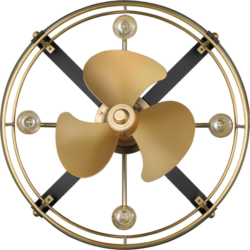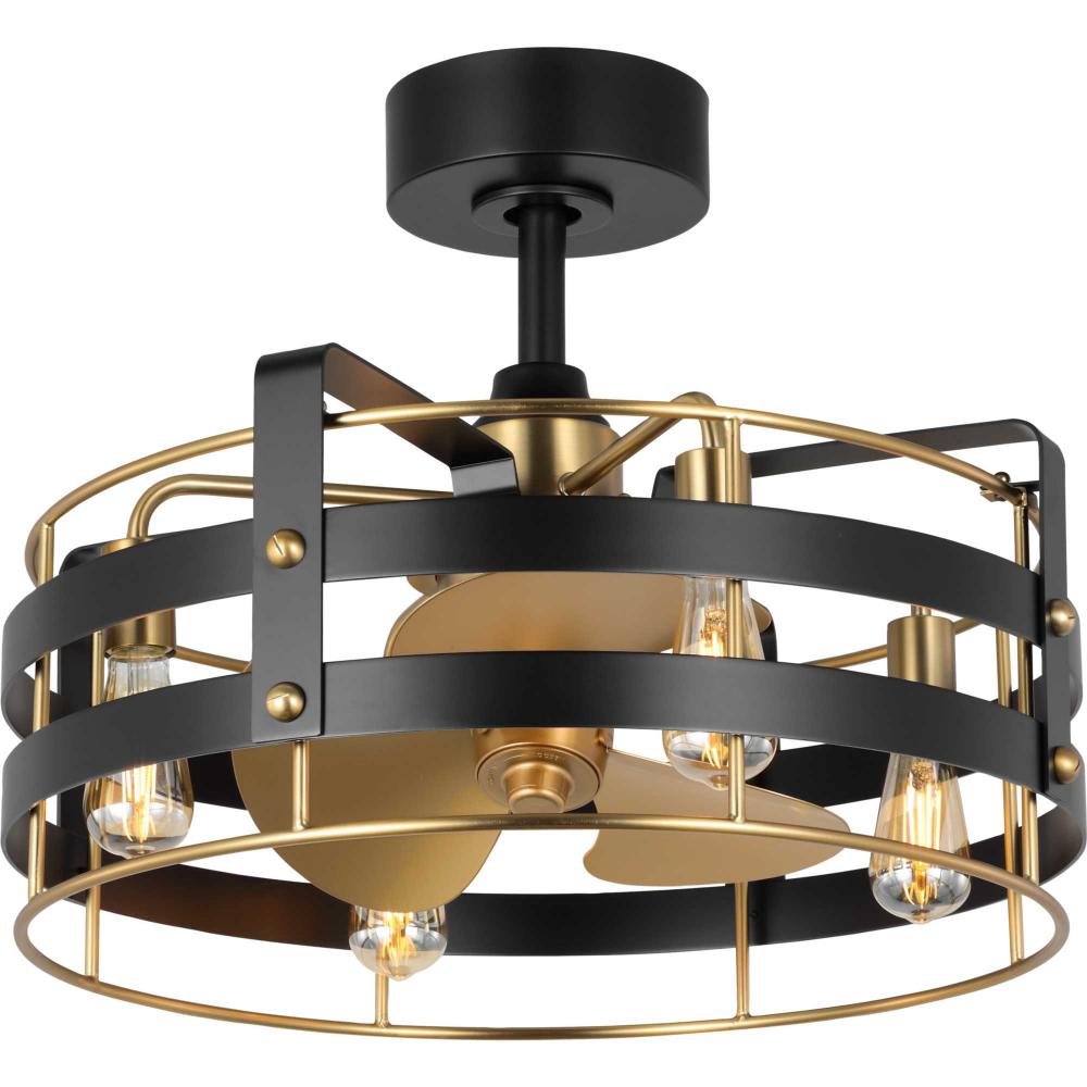 The rustic yet refined aesthetic of the 24-inch Sewell oscillating fandelier brings an urban industrial appeal to the ceiling. A trio of corrosion-resistant polycarbonate blades are enclosed within a striking Matte Black and Brushed Brass cage. Warm illumination is cast from the included decorative clear LED light sources. This fan is part of the new Oscillarâ„¢ Collection of ceiling fandeliers, featuring blades powered by a silent oscillating DC motor with a 360-degree rotation and six speeds, delivering maximum air distribution in every direction throughout a room. Sewell offers dual mounting, making it ideal for flat or sloped ceilings and it can accept a longer down rod. It is damp rated for inside and covered outdoor spaces and includes a full-function remote control and wall bracket.