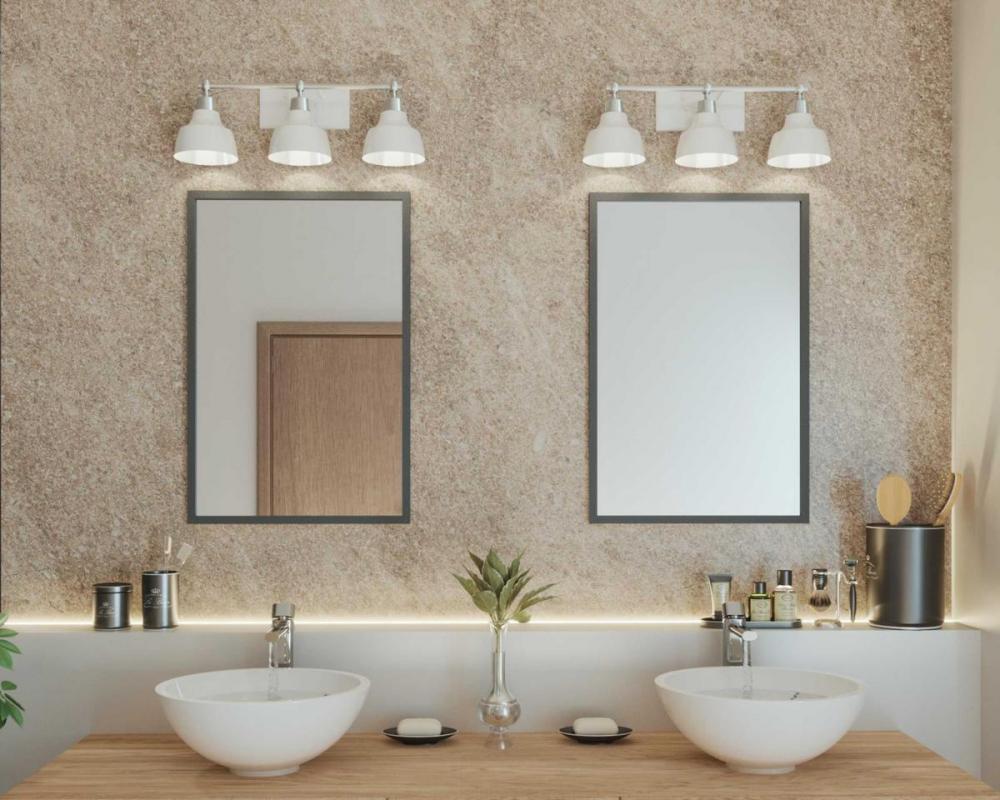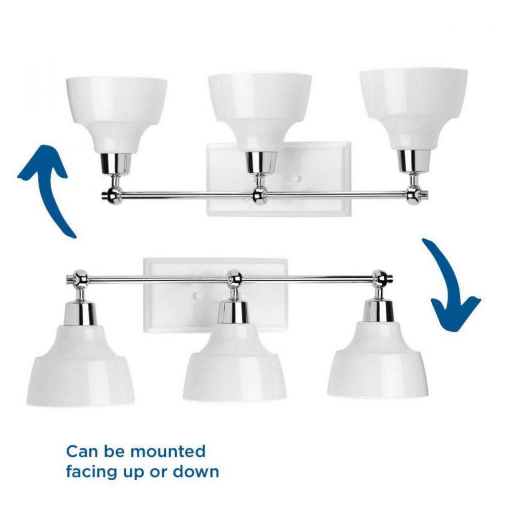 Ideal for a bathroom;Perfect for coastal, farmhouse, and urban industrial style settings;Gloss white with crisp polished chrome accents;Crisp white metal shades;Mount the light fixture facing up or down;Use 3 medium base bulbs that are sold separately (100