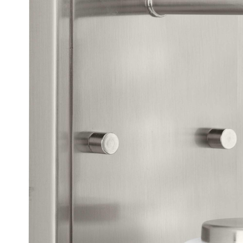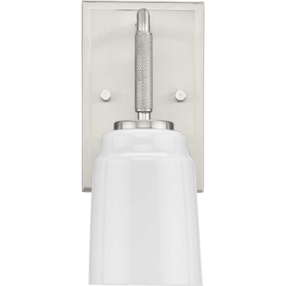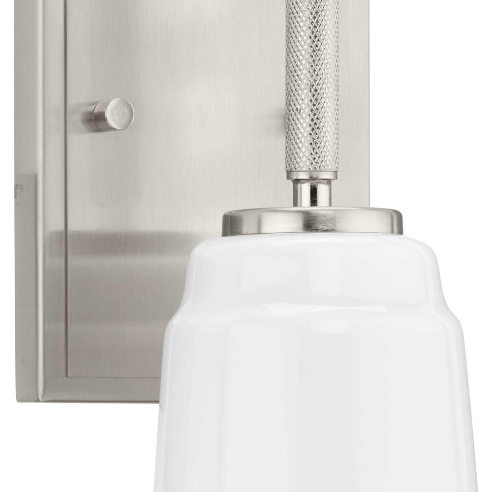 The Spenser vanity light has a streamlined design finished in subtle Brushed Nickel contrasted by machined industrial-styled knurling. A rounded opal glass shade softens the fixture’s industrial look. The versatile fixture can be mounted with the shade facing up or down to suit your preference.