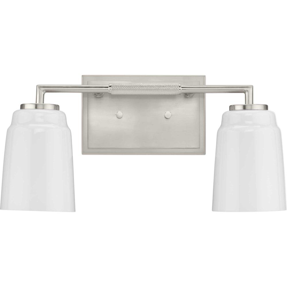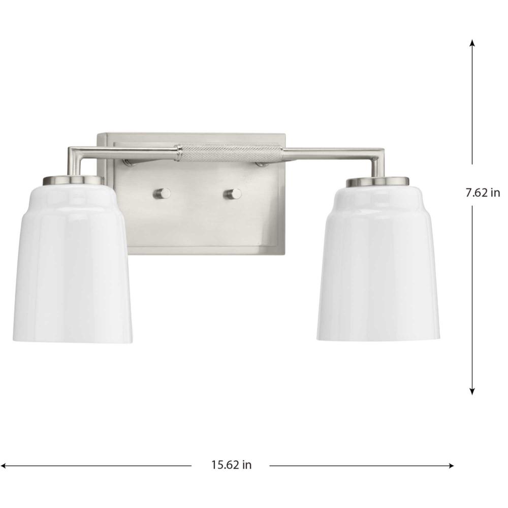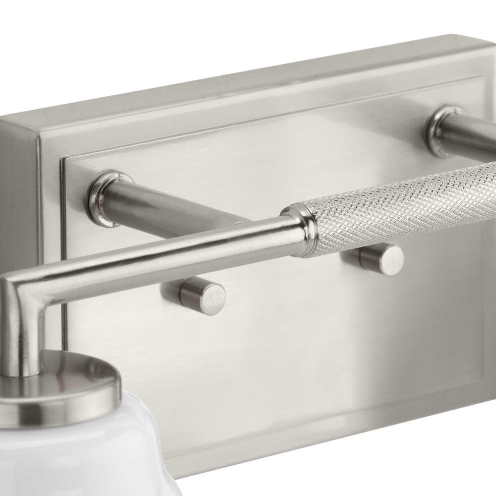 The Spenser vanity light has a streamlined design finished in subtle Brushed Nickel contrasted by machined industrial-styled knurling. Rounded opal glass shades soften the fixture’s industrial look. The versatile fixture can be mounted with the shades facing up or down to suit your preference.