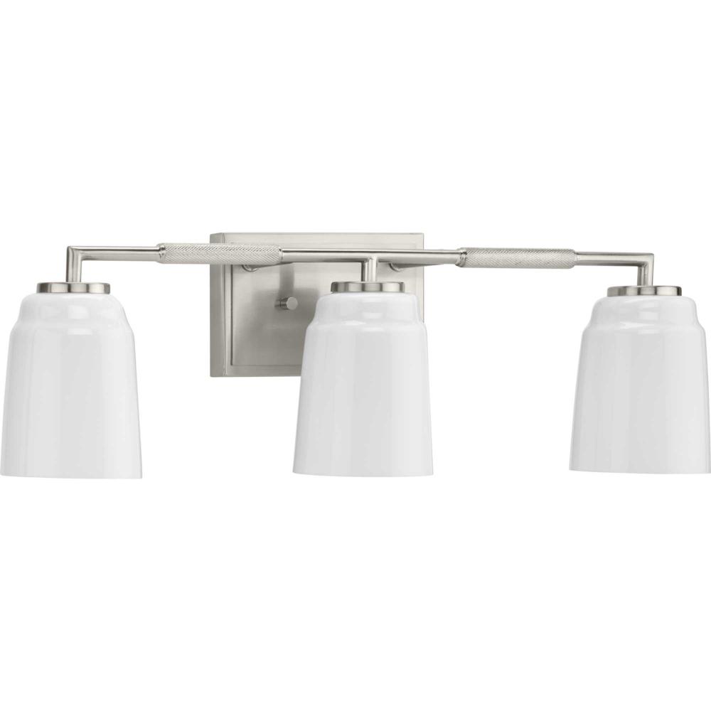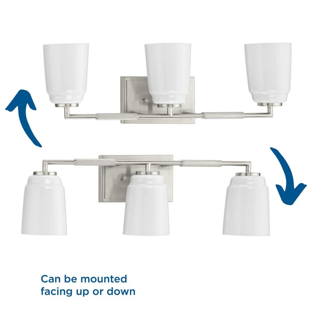 The Spenser vanity light has a streamlined design finished in subtle Brushed Nickel contrasted by machined industrial-styled knurling. Rounded opal glass shades soften the fixture’s industrial look. The versatile fixture can be mounted with the shades facing up or down to suit your preference.