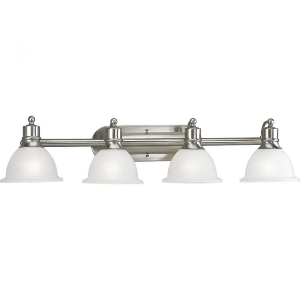 Ideal for a bathroom;Perfect for traditional and transitional style settings;Beautiful brushed nickel finish;Elegant etched glass shades;Mount the light fixture facing up or down;Use 4 medium base bulbs that are sold separately (100 W max - LED/CFL/incande