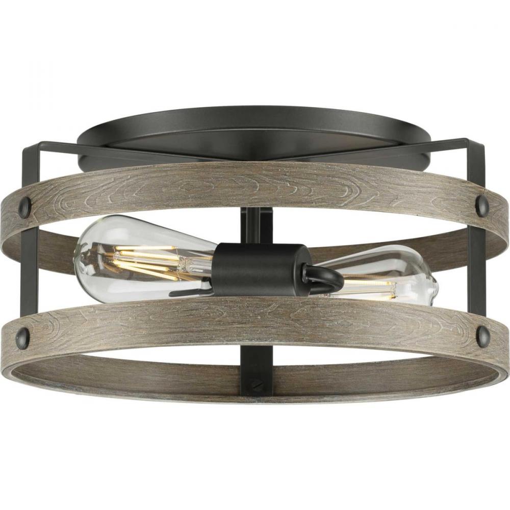 Cultivate an up-to-date country charm with the Gulliver Collection 2-Light Weathered Gray Farmhouse Flush Mount Ceiling Light. Light sources exude a comforting country glow as they peek through the circular bands of the open-cage design. The circular bands are constructed from a faux-wood coated in a weathered gray finish accented by graphite ceiling plate and metal details for perfect modern rustic character.