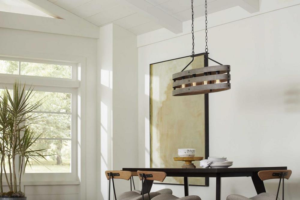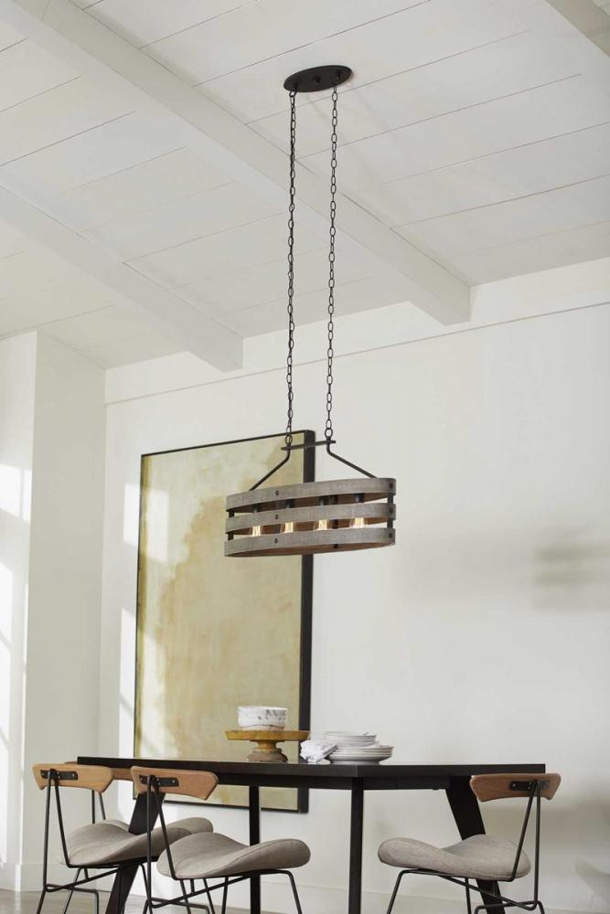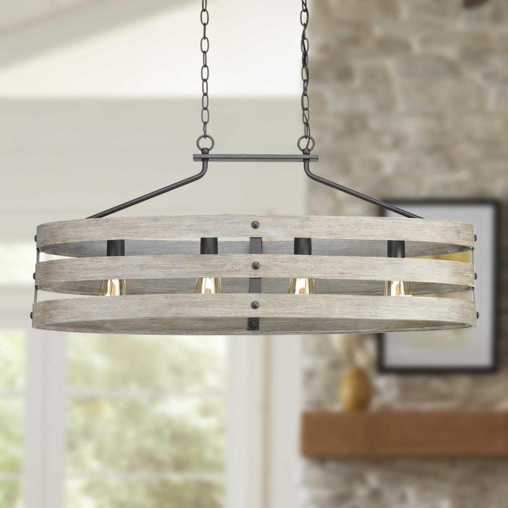 Three circular bands wrap together to create an open design for Gulliver four-light linear chandelier. Dual toned frame color combinations of Graphite with weathered gray accents. A hand painted wood grained texture complements Rustic and Modern Farmhouse home decor, as well as Urban Industrial and Coastal interior settings.