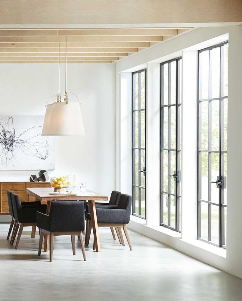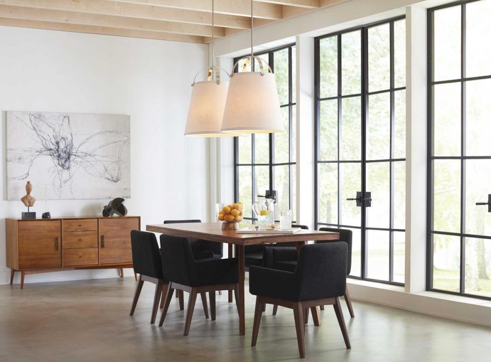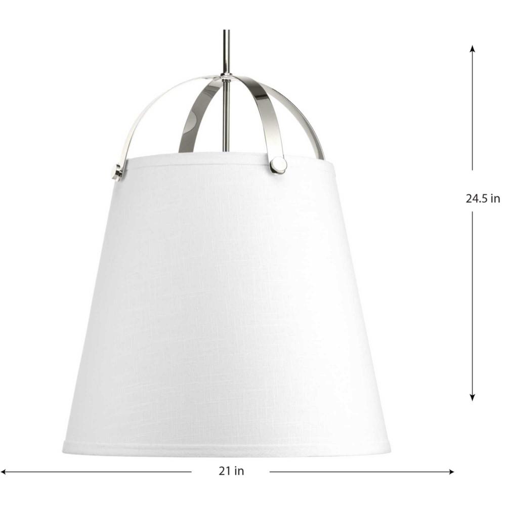 Galley is a simple modern form that complements both coastal decor and commercial style kitchens. The arched supporting frame features overscale metal turnings for an enhanced sense of architectural styling. The white linen shade is comprised of a rich, satin lining for the feel of a tailored fit and finish to complement the multi-light cluster. The three-light oversized pendant is 21"diameter with Polished Nickel finish.
