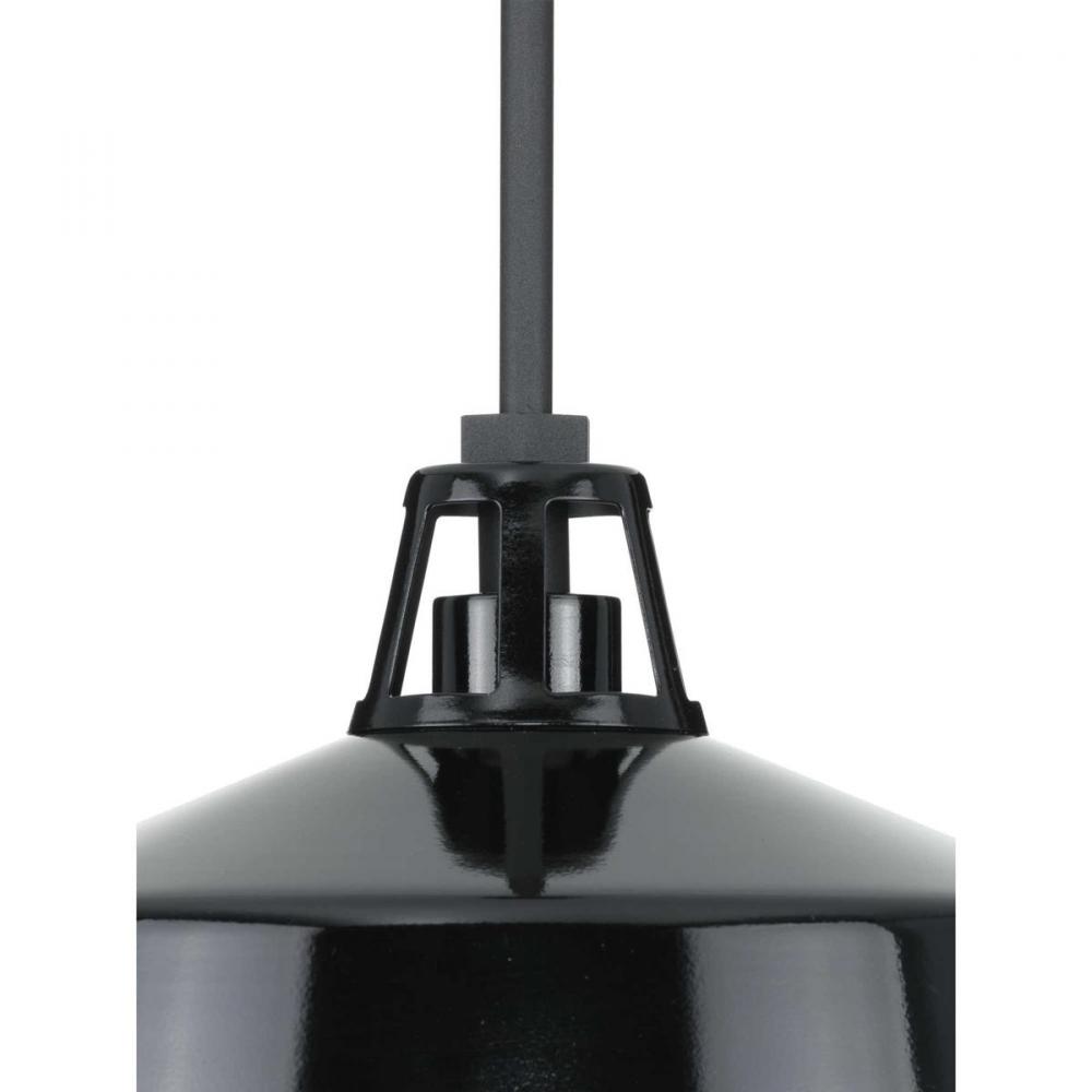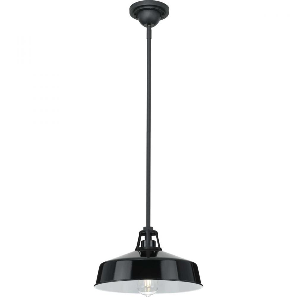 Enjoy a fun take on the traditional warehouse shade with a pendant light from the Cedar Springs Collection. The generous shade is coated in a gloss black finish with a white inside. A smooth black stem holds the ceiling light in place. This classic light fixture will upgrade any farmhouse or transitional style setting. Dark Sky Friendly.