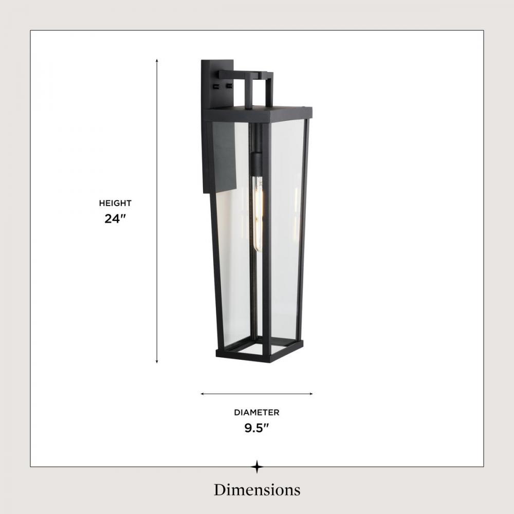 The Tryon Outdoor Wall Lantern features an elongated, tapered geometric frame finished in classic black that exudes refined simplicity. A sleek, squared arch connects the minimalist frame to the backplate while clear glass panels beautifully showcase a sin