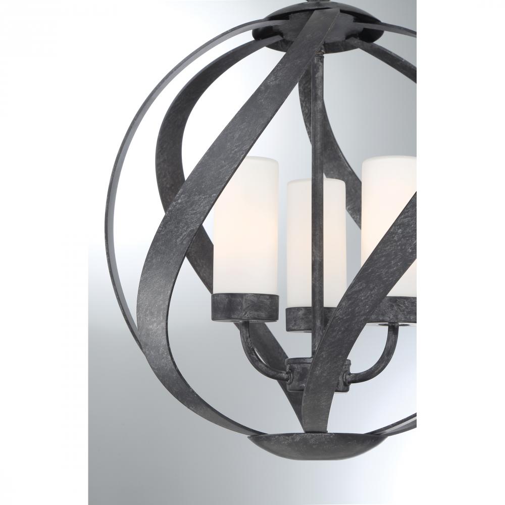 A spiral sensation, the Blacksmiths bold ironwork moves in soft curves along an orb-shaped silhouette. The old black finish includes accents of charcoal and dark silver for a sultry, smoke-like effect. The candles are fitted with cylindrical shades in fros
