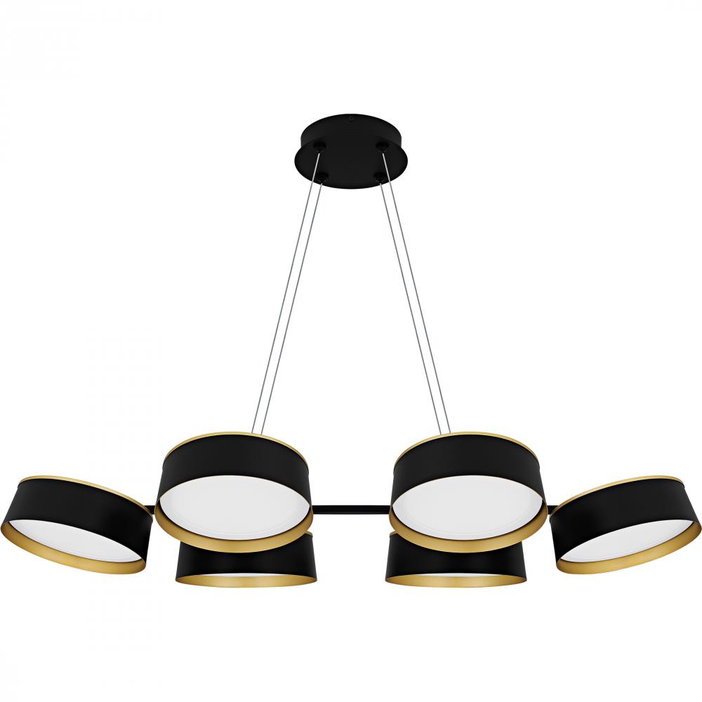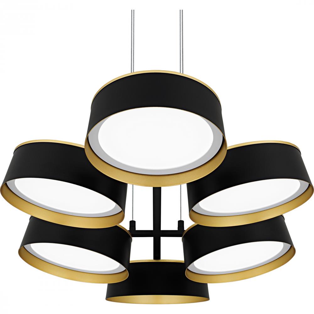Elevate your space with Byrnes, where modern design meets luxury. The striking combination of matte black and gold creates a sophisticated look in this unique fixture. Featuring a cluster of round metal shades, each equipped with an integrated LED light so