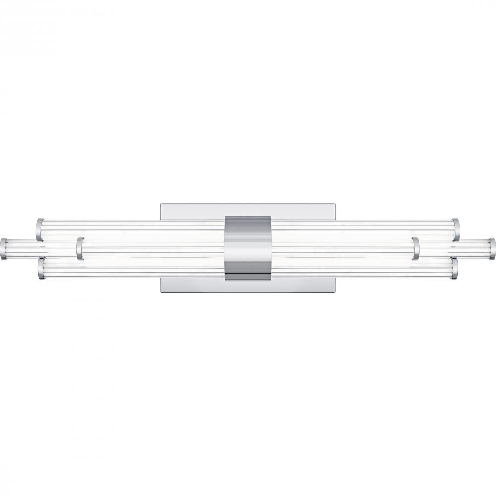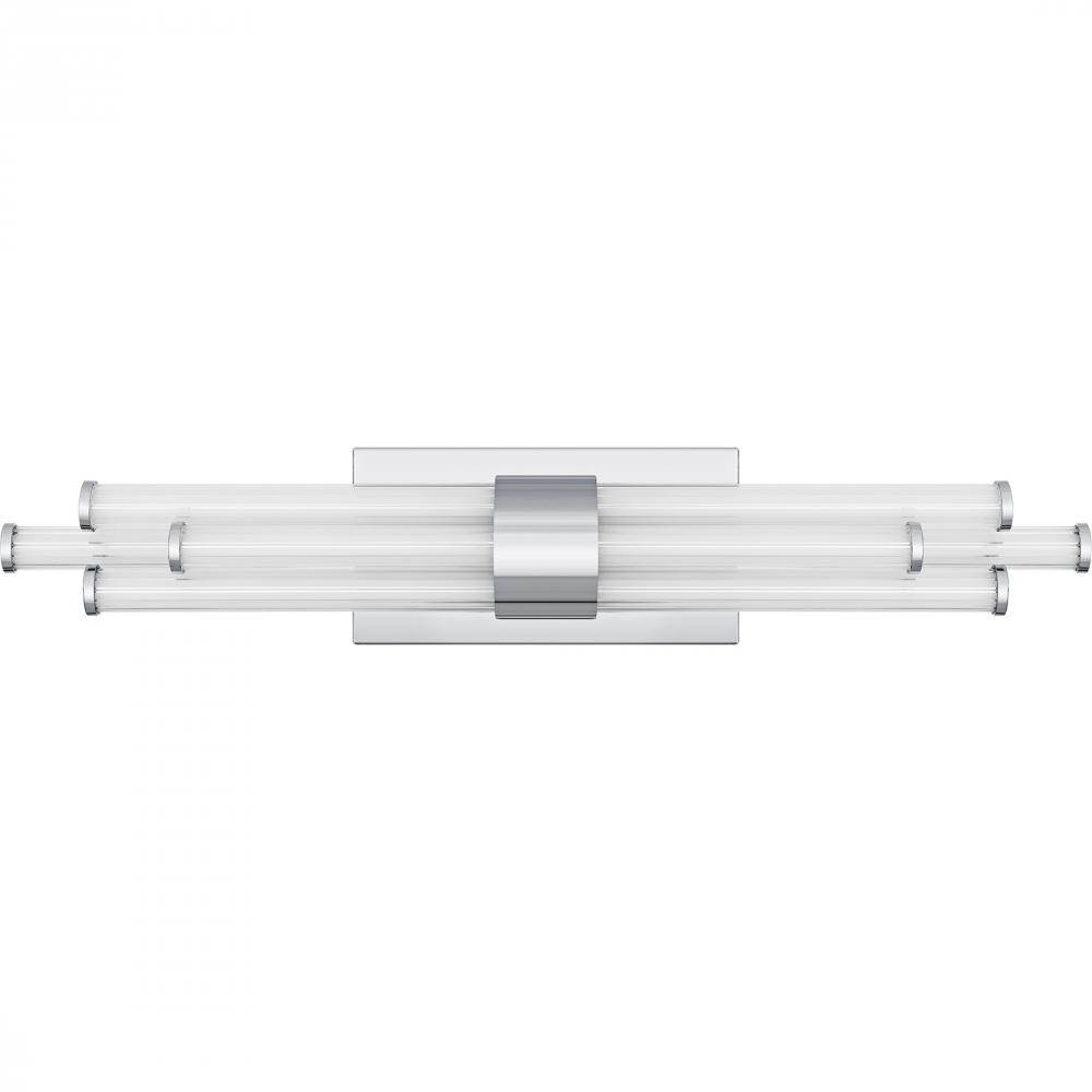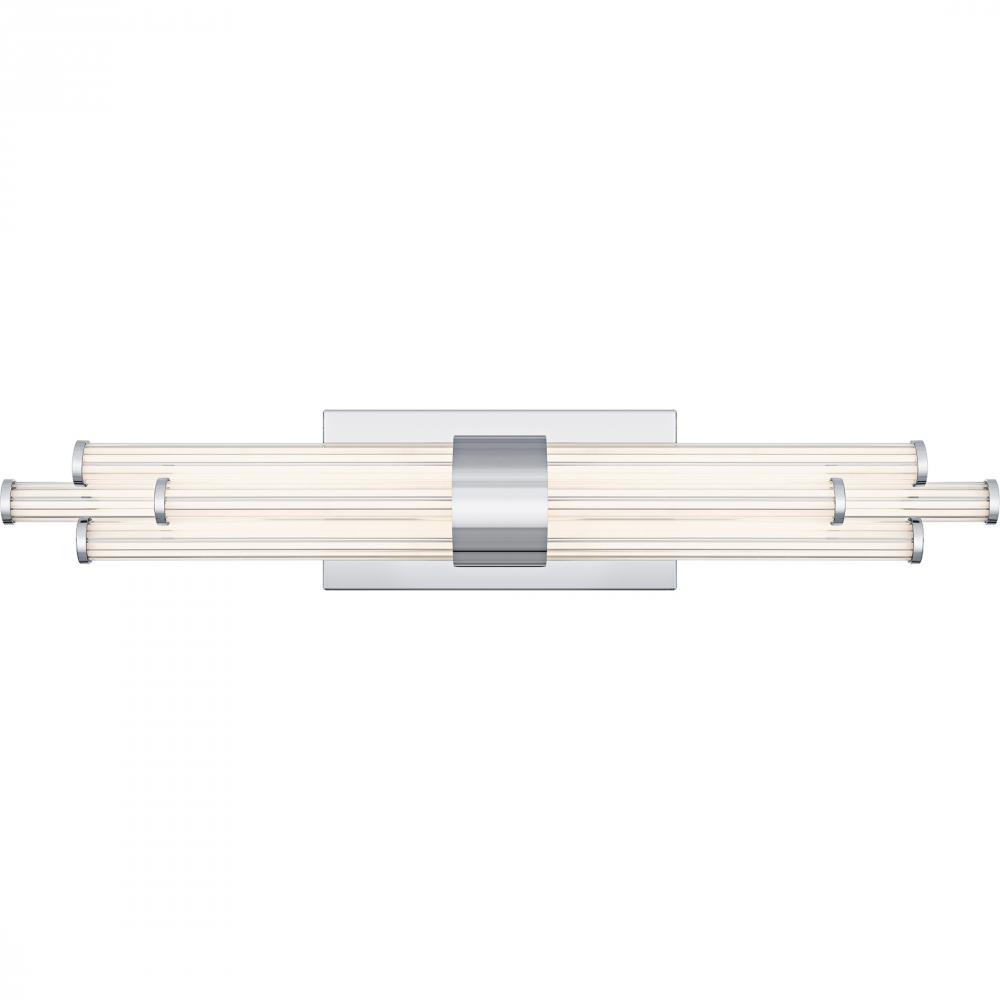 The Talbott bath light features a striking modern design with a sleek, minimalist aesthetic. The rectangular backplate contrasts with the series of parallel cylindrical acrylic rods, creating a unique and eye-catching visual. Each rod houses an integrated