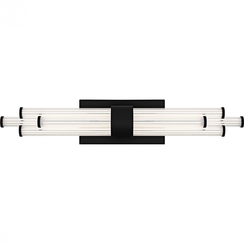The Talbott bath light features a striking modern design with a sleek, minimalist aesthetic. The rectangular backplate contrasts with the series of parallel cylindrical acrylic rods, creating a unique and eye-catching visual. Each rod houses an integrated