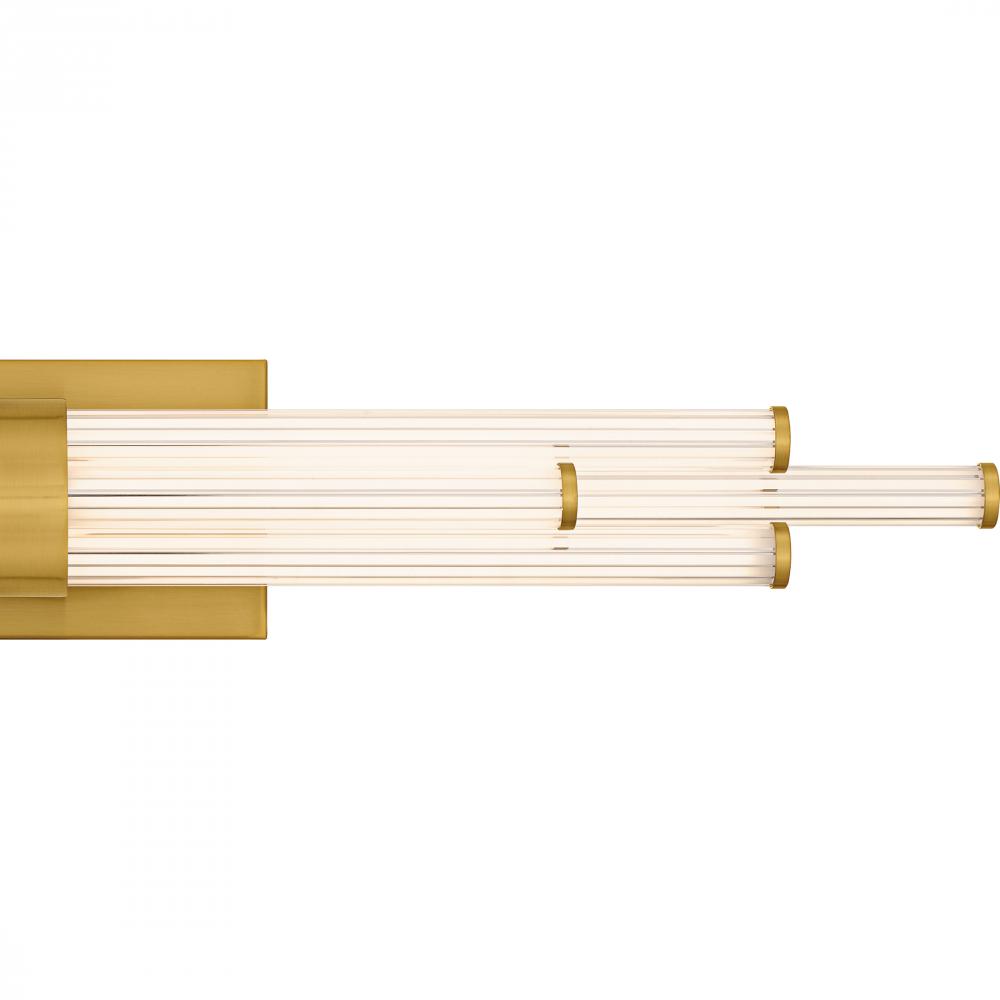 The Talbott bath light features a striking modern design with a sleek, minimalist aesthetic. The rectangular backplate contrasts with the series of parallel cylindrical acrylic rods, creating a unique and eye-catching visual. Each rod houses an integrated