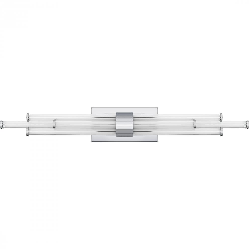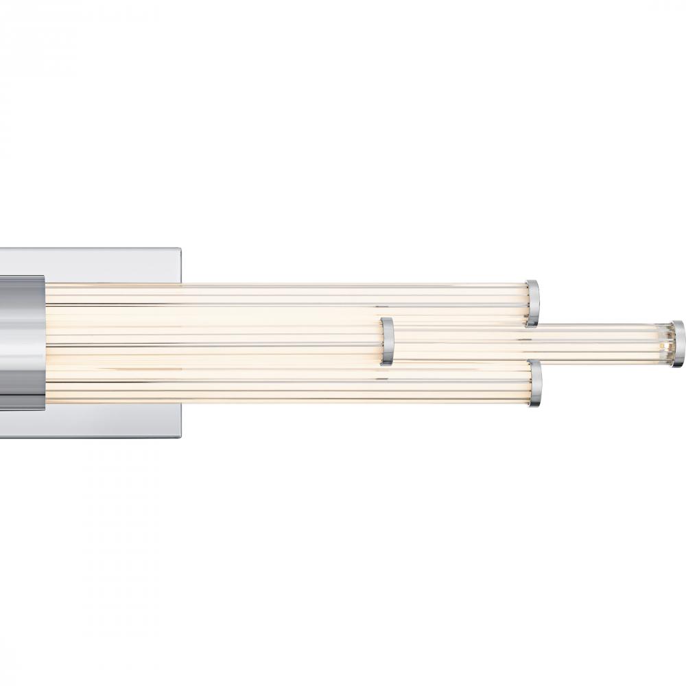 The Talbott bath light features a striking modern design with a sleek, minimalist aesthetic. The rectangular backplate contrasts with the series of parallel cylindrical acrylic rods, creating a unique and eye-catching visual. Each rod houses an integrated