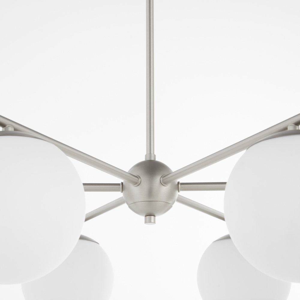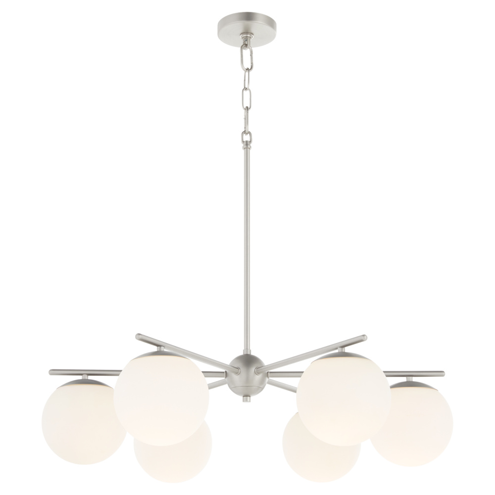 Part of the Main Street collection, the Jasper collection showcases a modern hub-and-spoke design with round globe shades and clean symmetry. Available in matte black or satin nickel and offered in both 3-light and 6-light configurations, it’s designed to suit a range of modern interiors.