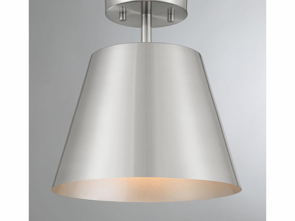 This sleek, chic 1-light ceiling semi-flush mount has a bold solid metal shade to concentrate and direct the light for a bright and dramatic glow. Its Brushed Nickel finish heightens the appeal. 11" height, 10" width, uses 1 standard size bulb of up to 60 watts. Bulb not included.