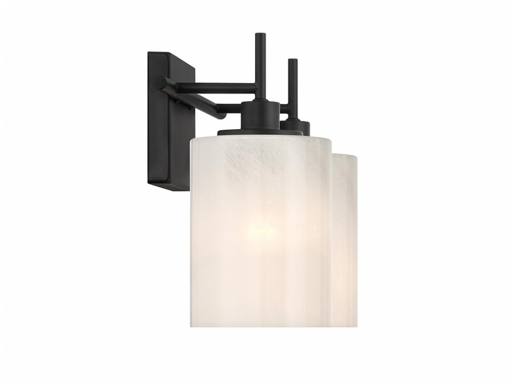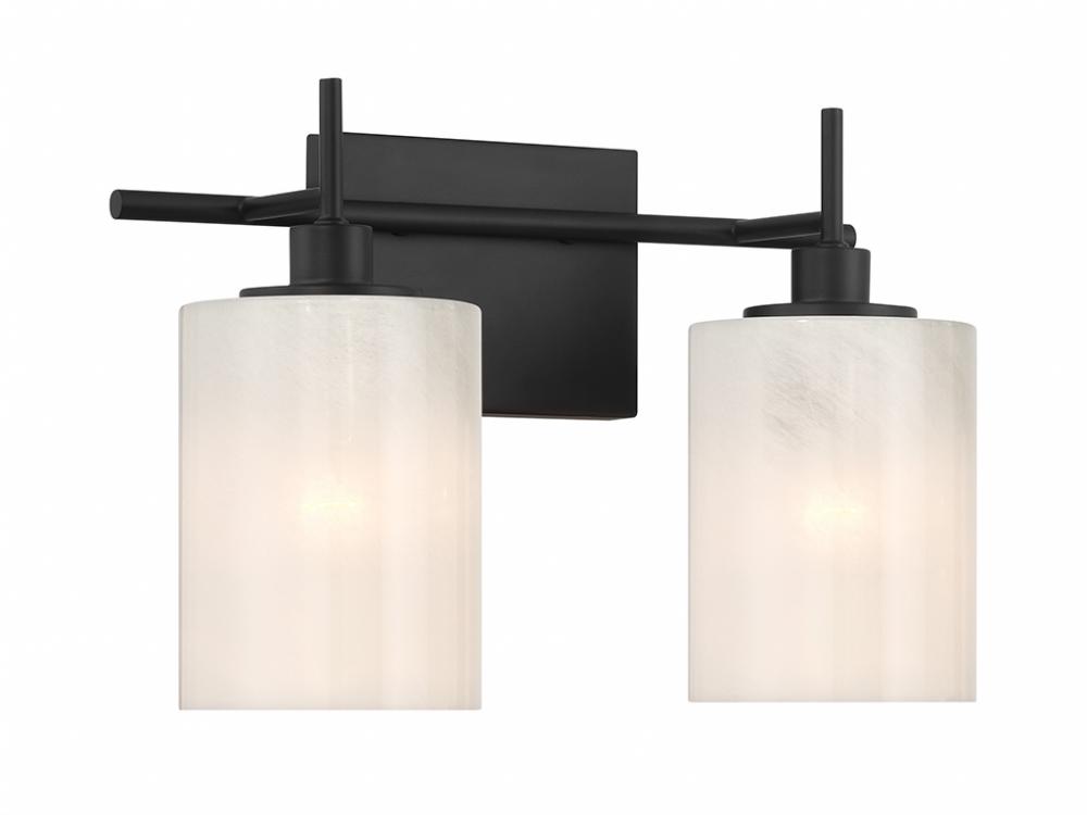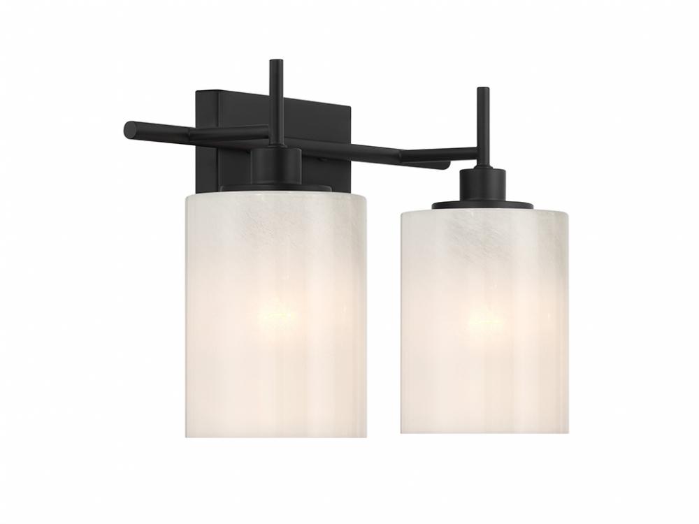Brighten up your bath easily and beautifully with this 2-light bath bar, which showcases shades of strie glass featuring dazzling swirls that draw the eye, soften the glow and work beautifully with the Matte Black finish. It is 9.75" in height, 14" in width and extends 6.5" from the wall. Uses two standard size bulbs of up to 60 watts per bulb. Bulbs not included.