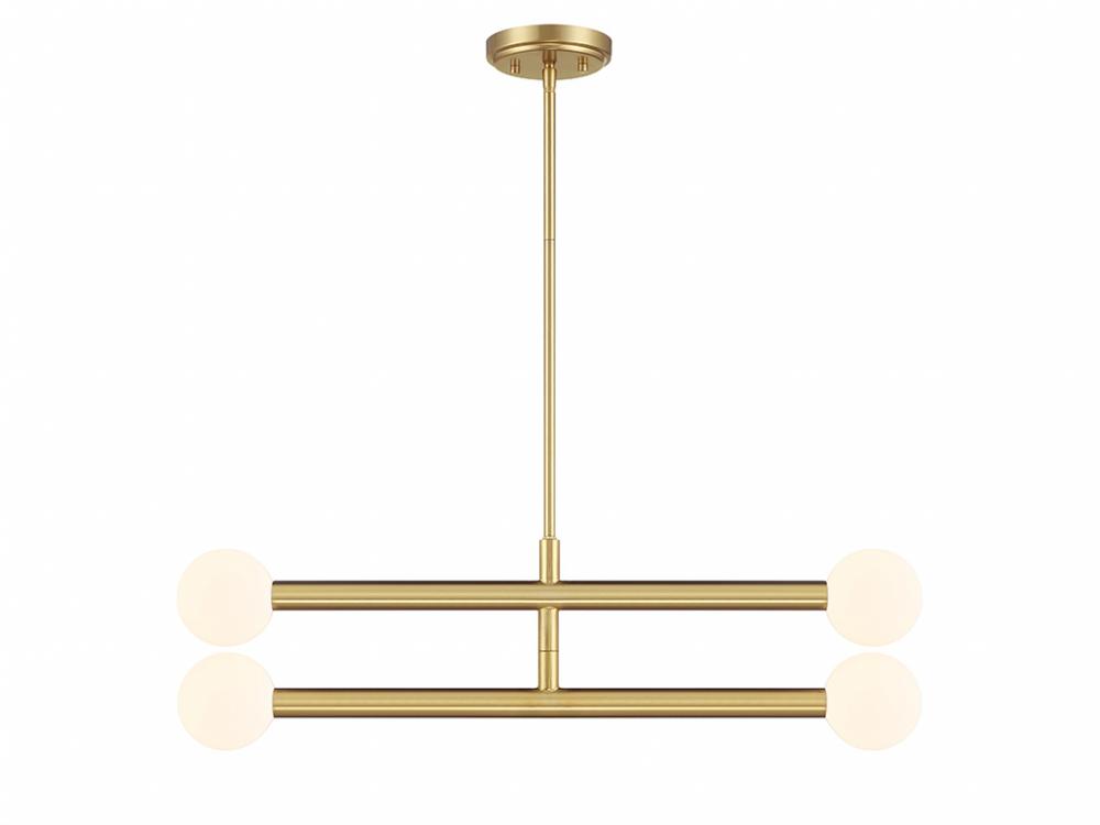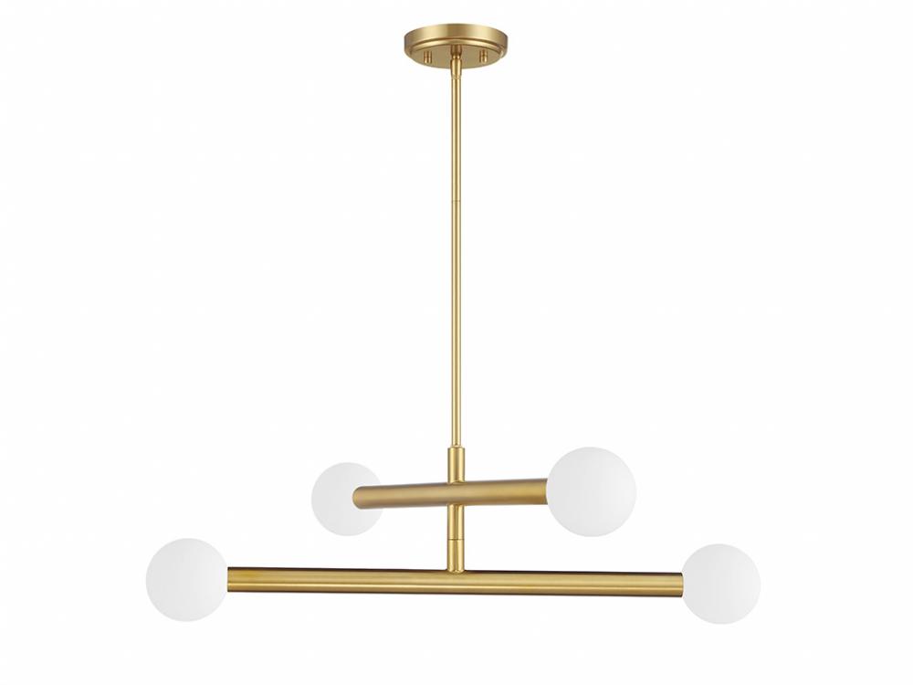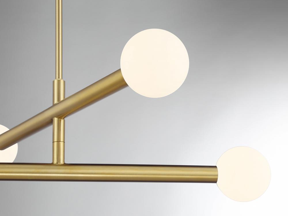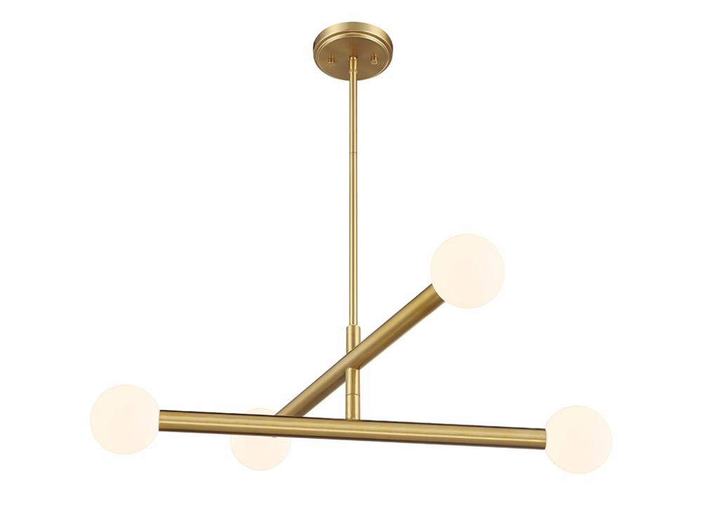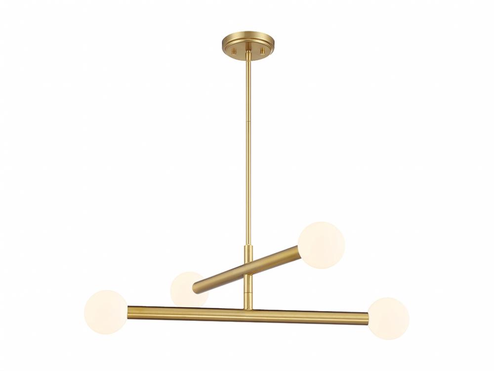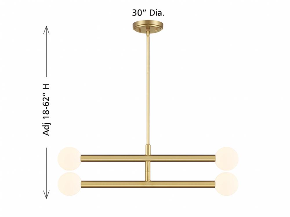 This perky, peppy 4-light chandelier has an understated style that makes a big impact! The light shines from inside orbs of white opal glass and the Natural Brass finish works beautifully with any decor. You can even rotate the arms for a customized look! This chandelier is 30" in width and has an adjustable height ranging from 8" to 62". It comes with four 12" downrods and one 6" downrod. Uses four G9 LED bulbs of up to 3.5 watts per bulb. Bulbs not included.