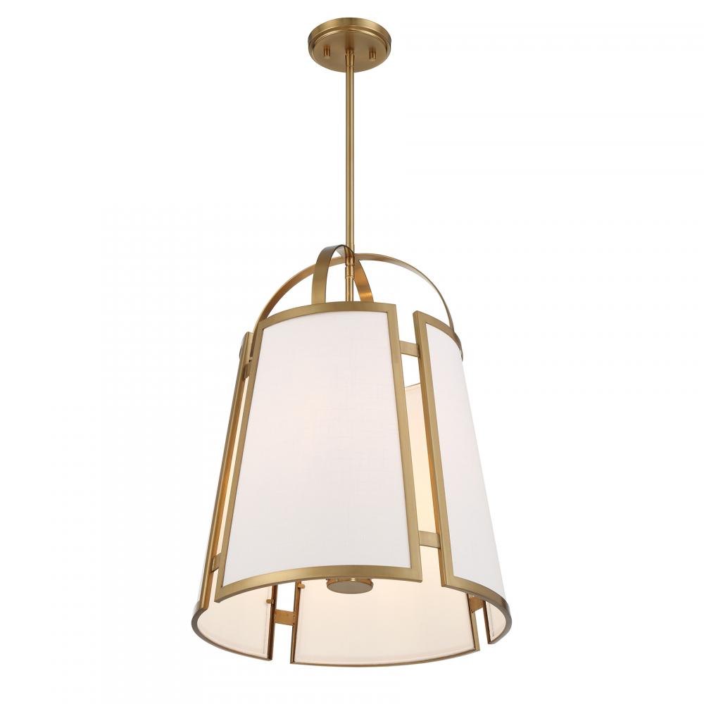 Add a prim and polished look to your home with the Savoy House Chartwell 4-light pendant. The uniquely intriguing shade flaunts cutaway detailing and panes with white linen fabric. Two flat, slim bands help to connect the shade to the downrod. Warm Brass finish. Chartwell is 16.75" in width and has an adjustable height ranging from 22.5" to 76.5". Comes with four 12" downrods and one 6" downrod. Uses four candelabra size bulbs of up to 60 watts per bulb. Bulbs not included.