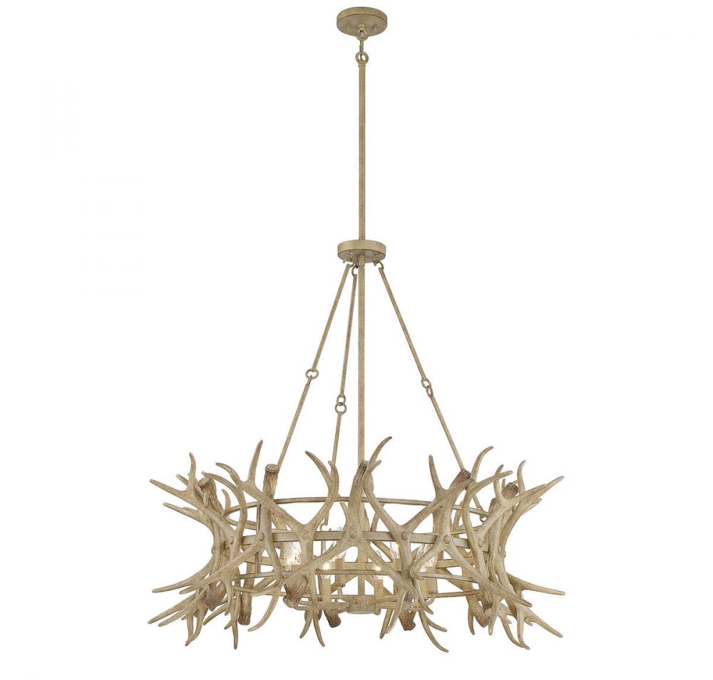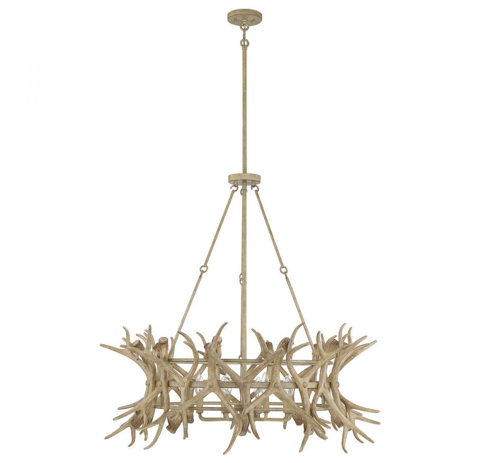 The chic Savoy House Daniels 8-light chandelier updates the rustic charm of antler chandeliers with a casual sophistication. With its natural finish and open ring style, Daniels transports you to a cozy yet stylish mountain cabin. This chandelier is 40" in width and has an adjustable height ranging from 44" to 90". It uses eight candelabra size bulbs of up to 60 watts per bulb. Comes with four 12" downrods and one 6" downrod, plus 80" of cord.