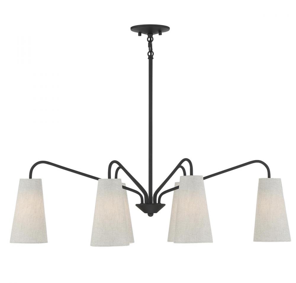 The Savoy House Edgewood 6-light linear chandelier showcases a relaxed, casually stylish look with tall conical shades of oatmeal fabric and a versatile matte black finish. Perfect for brightening up kitchen islands, dining room tables and more. Edgewood is 35" in length and 16.13" in width. It has an adjustable height ranging from 16" to 62". It uses six candelabra size bulbs with a max of 60 watts per bulb. Comes with four 12" downrods and one 6" downrod, plus 80" of cord.