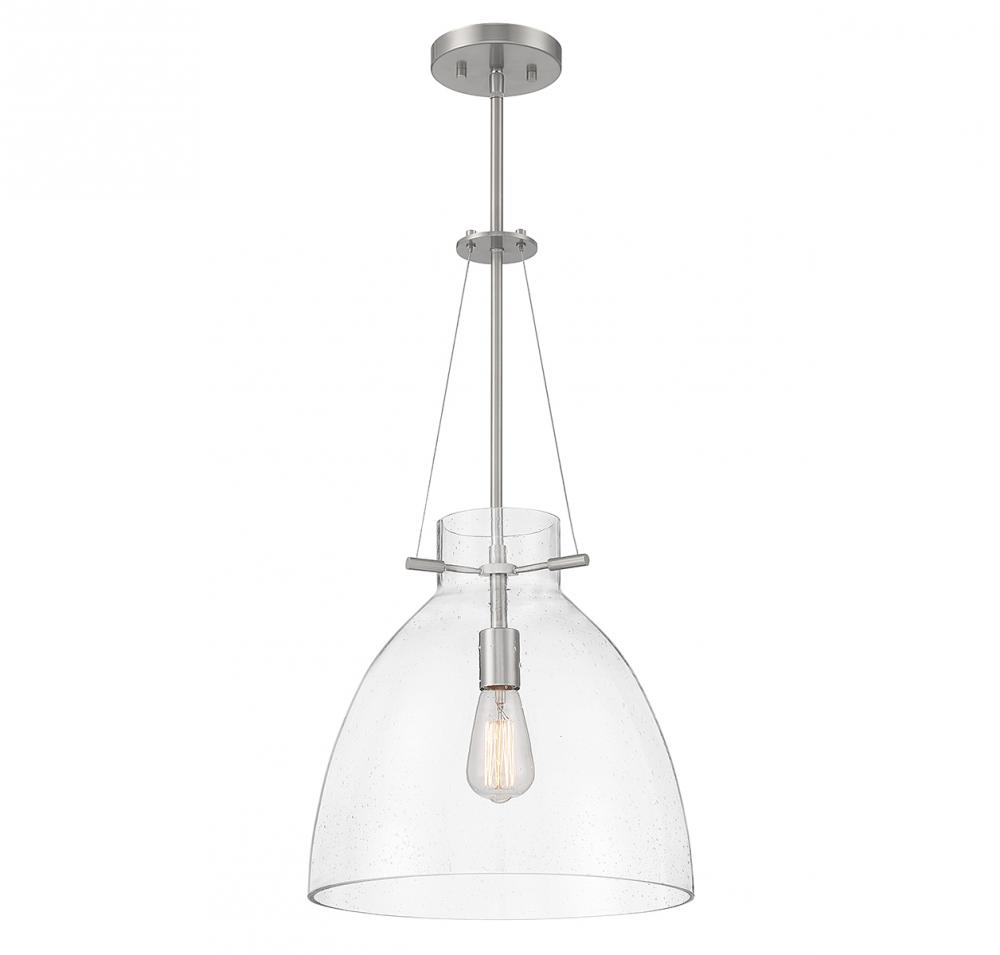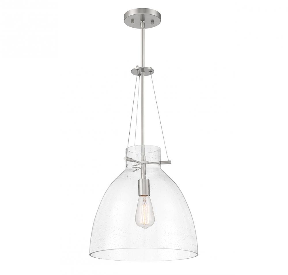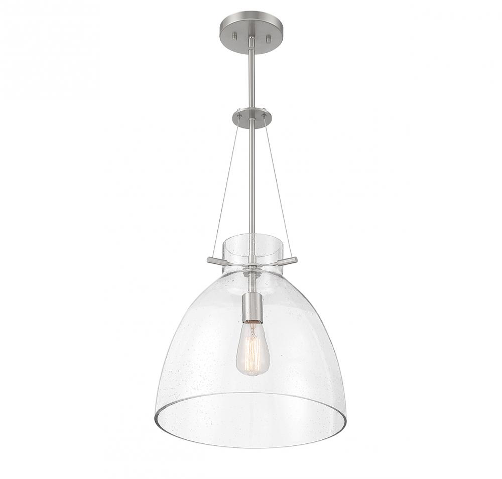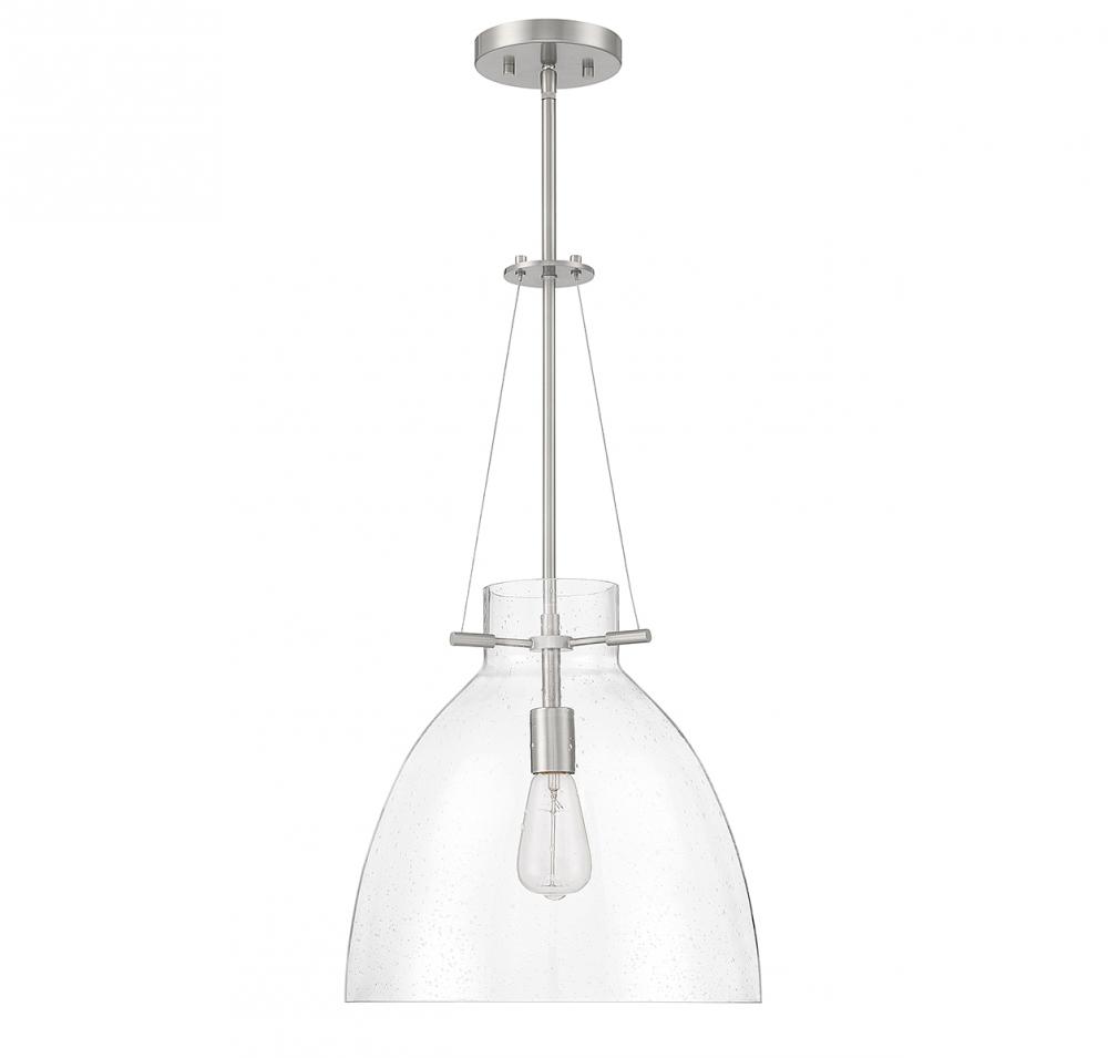 The Savoy House Foster 1-light pendant is the perfect way to add a sleek look to any space. Its large shade of clear seeded glass has a pleasantly curving shape and pairs nicely with the satin nickel finish. Foster is 25.50" in height and 14" in width. It uses 1 standard size bulb with a max of 60 watts (bulb not included). Comes with four 12" downrods and one 6" downrod.