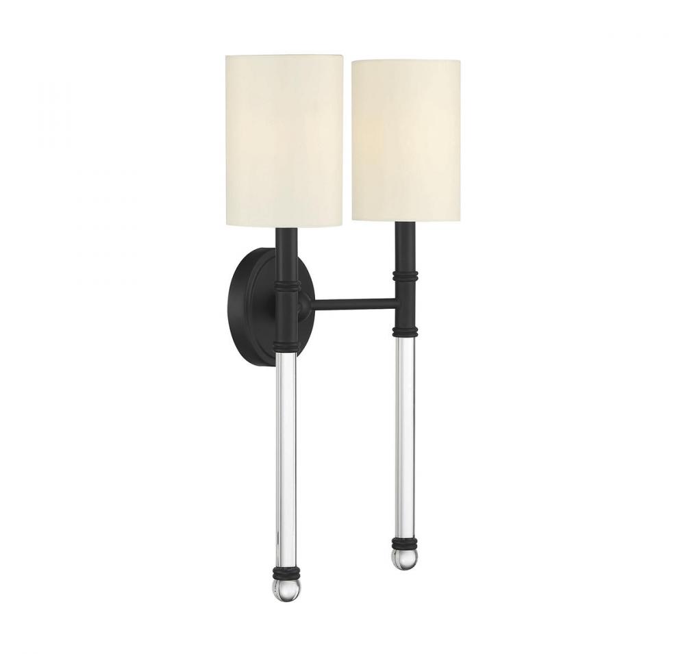 Slim and stylish! This Savoy House Fremont 2-light sconce packs a whole lot of textural interest into one slender silhouette. The round wall plate and light arms have double ring detailing and a matte black finish. The long tails of those arms are made of clear glass with a double ring above the glass ball finials. The cylindrical shades are a lovely soft white fabric. Altogether, it’s an elegant fixture that is a pleasure to have in your home. Two 60W candelabra size bulbs fit within the shades of this 13" wide and 21" high sconce. It’s the perfect size to place alone, in pairs or in groups along the walls of your dining room, kitchen, living room, entryway, bedroom, bathroom, office, family room, media room or hallway.