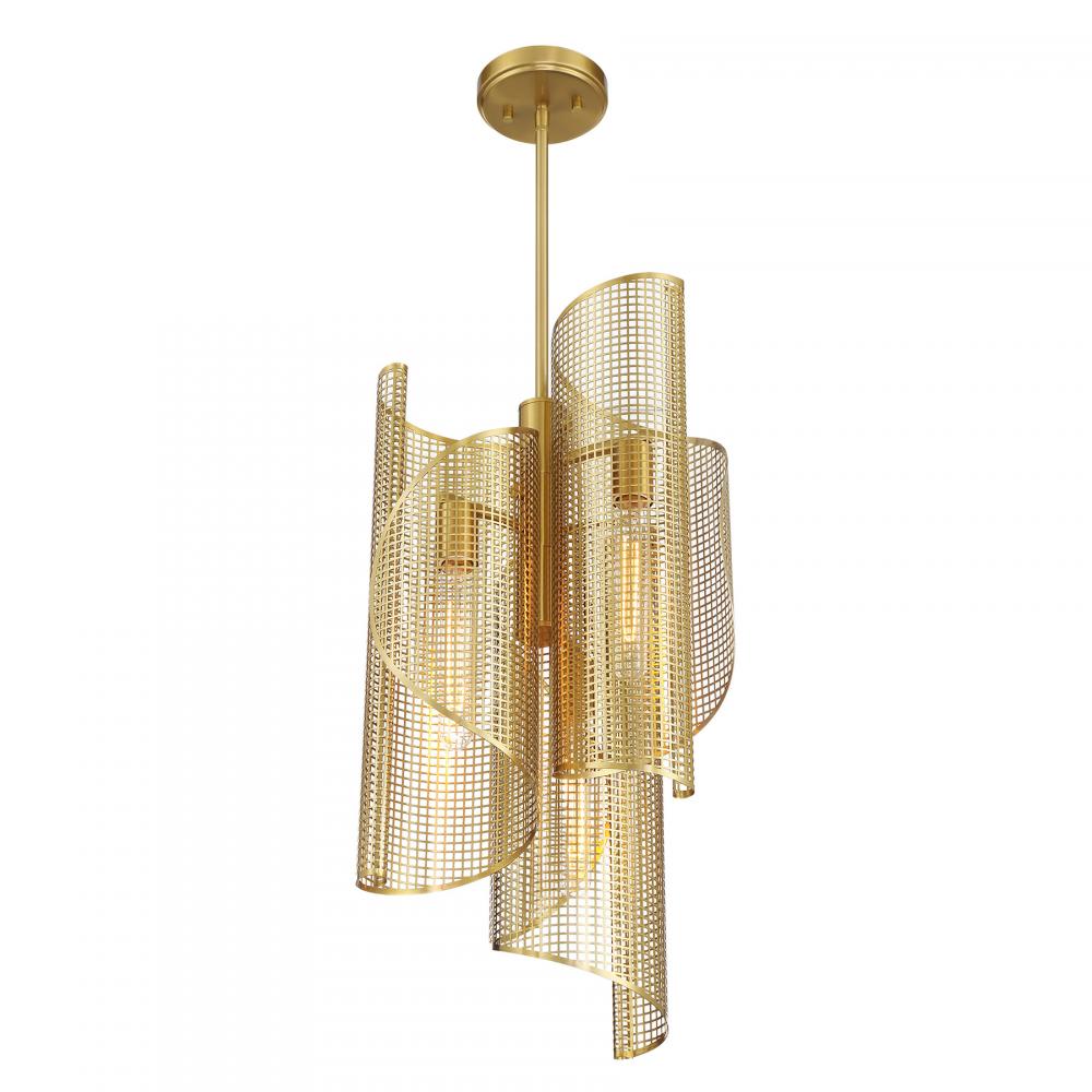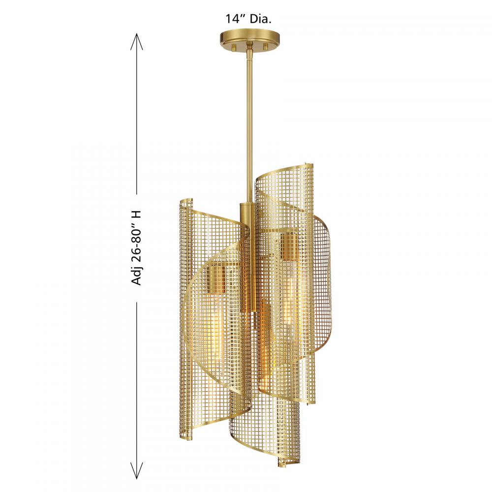 The Savoy House Hillbourne 3-light pendant showcases ribbons of intriguing urban loft style. Its perforated metal shades, finished in Warm Brass, appear to swirl and twirl beautifully. Hillbourne is 14” in width and has an adjustable height ranging from 26” to 80”. Uses three standard size bulbs of up to 60 watts per bulb. Bulbs not included. Comes with four 12” downrods and one 6” downrod.