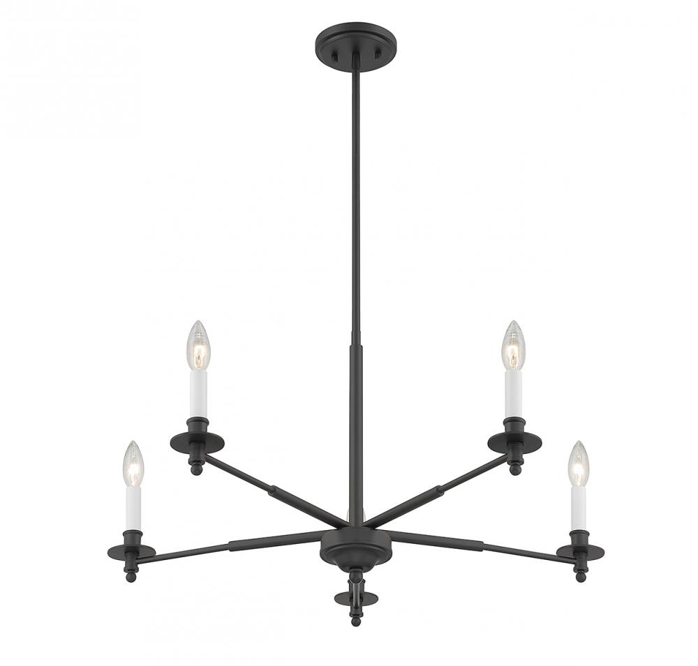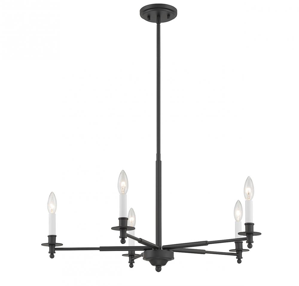 The Savoy House Jasmine 5-light chandelier has a traditional-inspired look that is perfectly versatile for a wide range of spaces and styles. Matte black finish with white candle covers. Jasmine is 30" in width and has an adjustable height ranging from 16" to 69.5". Comes with four 12" downrods and one 6" downrod. It uses 5 candelabra size bulbs of up to 60 watts per bulb (bulbs not included).