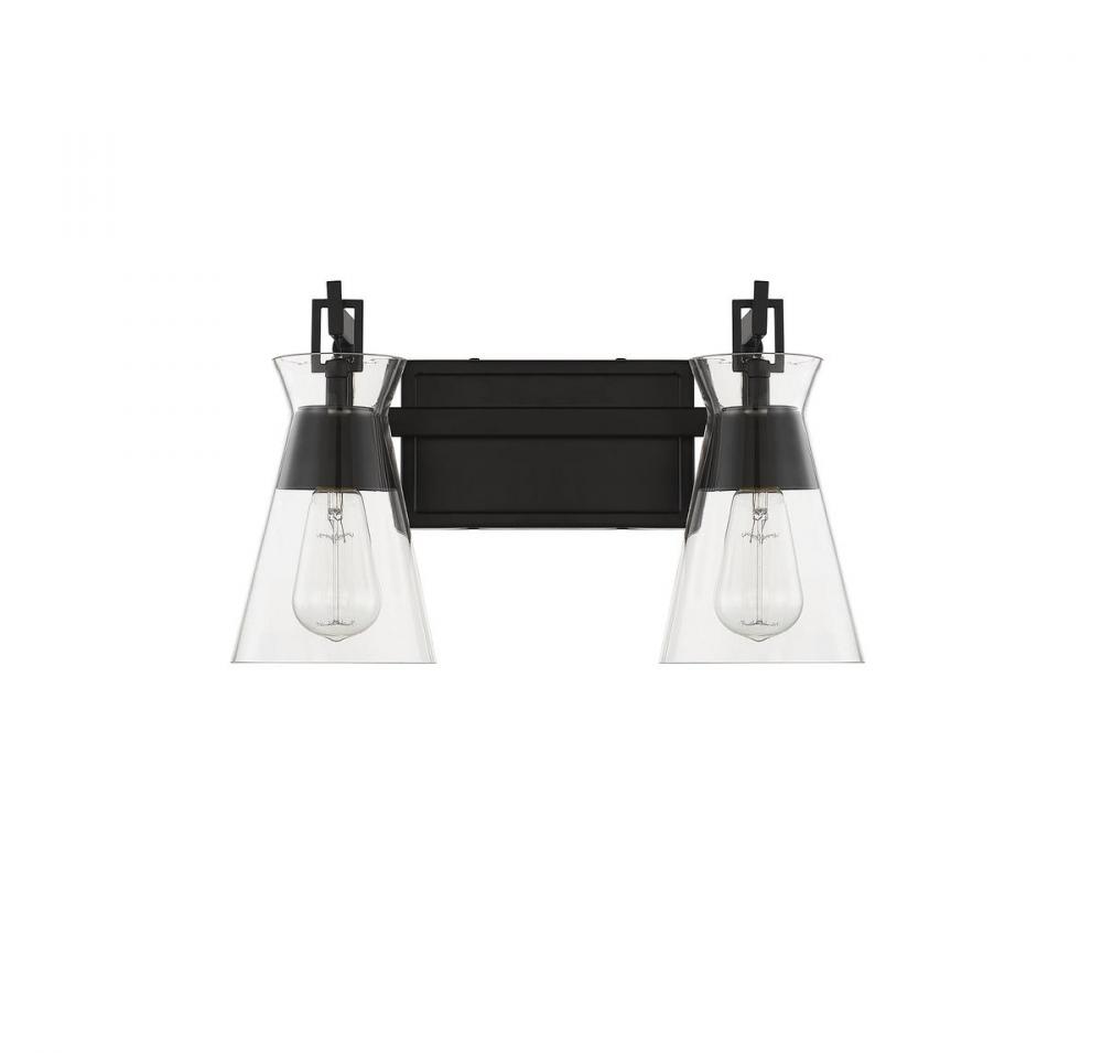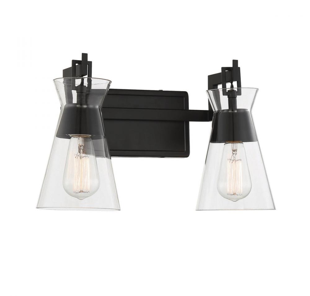 Conical shades of clear glass recall Italian midcentury modern lighting designs in the stylish Lakewood 2-light bath vanity light from Savoy House. The glass is suspended from angular reimaginings of shepherd's hooks and the fixture is finished in bold matte black. Lakewood is 9.5" in height, 16" in width and extends 6.5" from the wall. It uses two standard size bulbs with a max of 60 watts per bulb. Damp area rated.