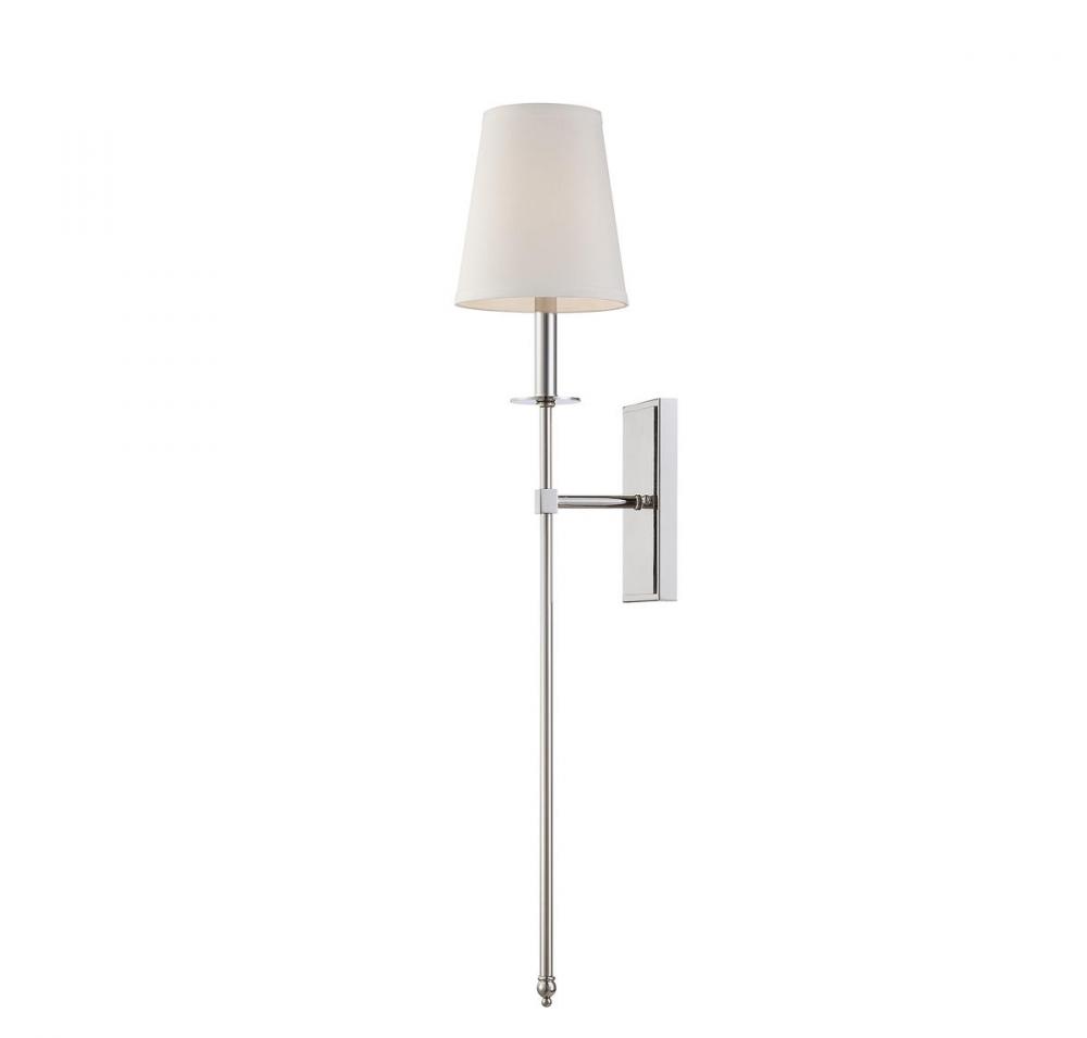 This Savoy House Monroe 1-light sconce features a long sleek body, a white fabric shade and a classy, contemporary silhouette. polished nickel finish. Sconces add a touch of style and light to any wall, including but certainly not limited to hallways, entryways, stairways, great rooms and dining rooms. You will also often see a pair of sconces flanking a bathroom vanity mirror to provide an even, flattering wash of light. Bulb not included. The polished nickel finish can be paired with nickel hardware or mixed with hardware in other finishes. Monroe is a perfect addition to rooms of any style, especially transitional or classic. When you choose a Savoy House lighting fixture, you can be certain you’ve selected a piece that will withstand the test of time.