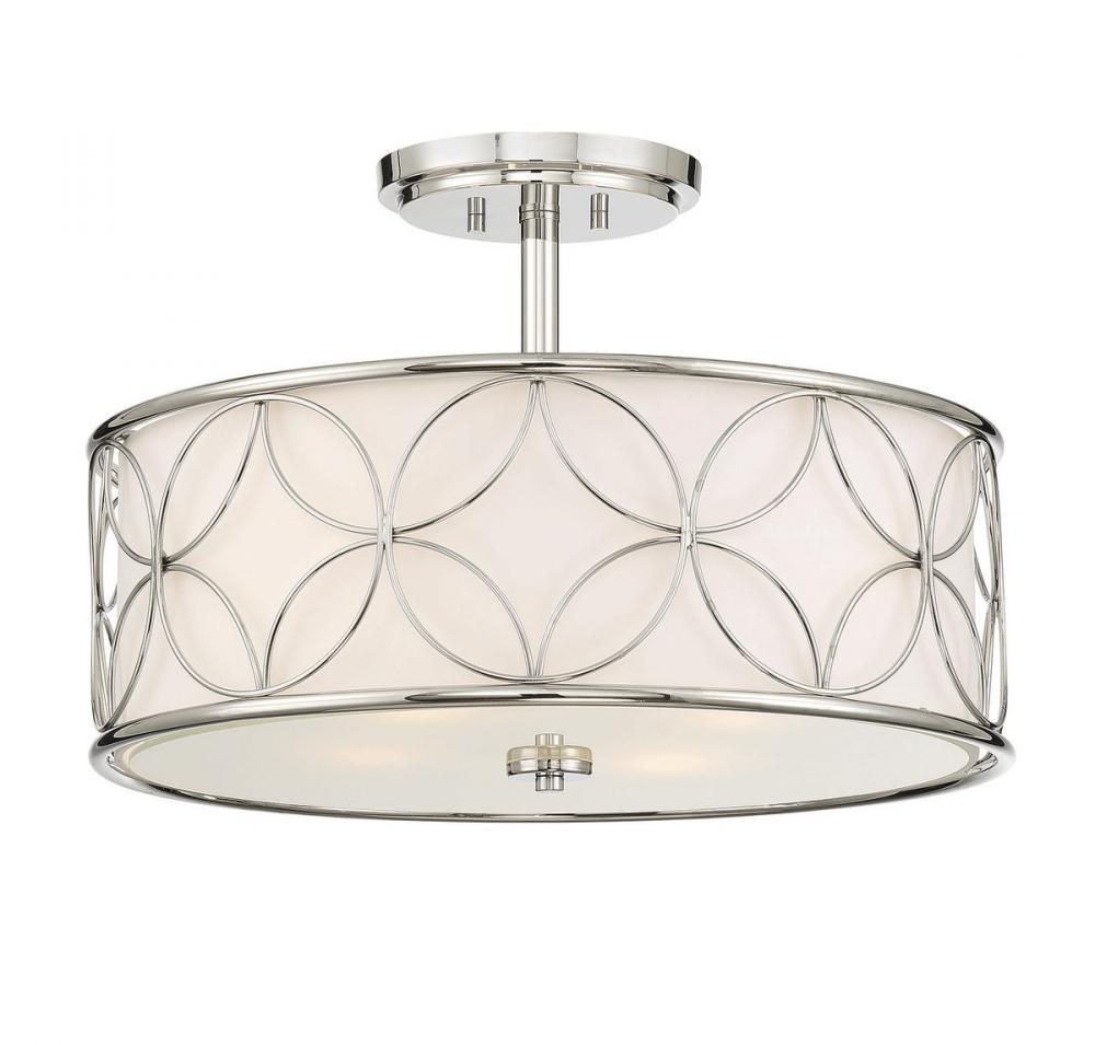 A beautiful geometric pattern adorns this Savoy House Reid 4-light ceiling light. Finished in polished nickel, the pattern pops brightly against the inner white fabric shade. Reid is perfect for boosting the illumination in any room, even smaller spaces. It is 13.5" in height and 20" in diameter. It uses four standard size bulbs of up to 60 watts per bulb.