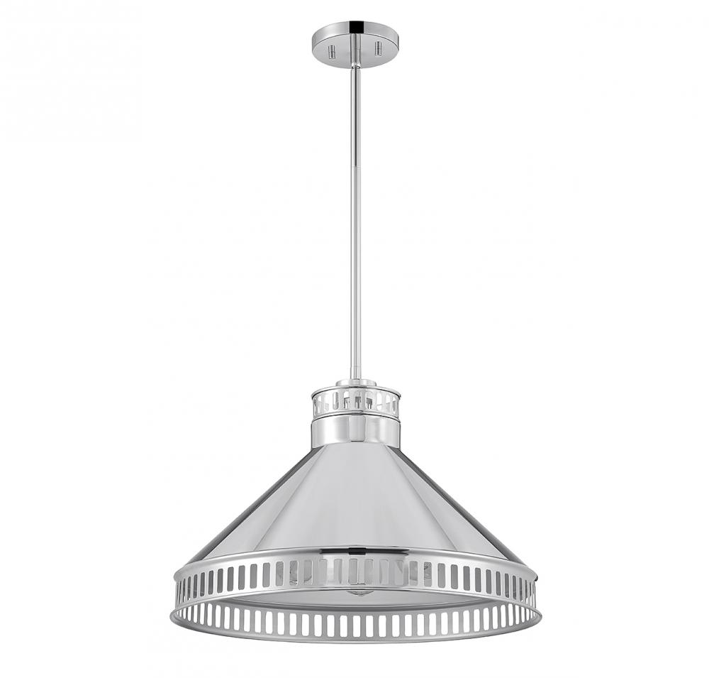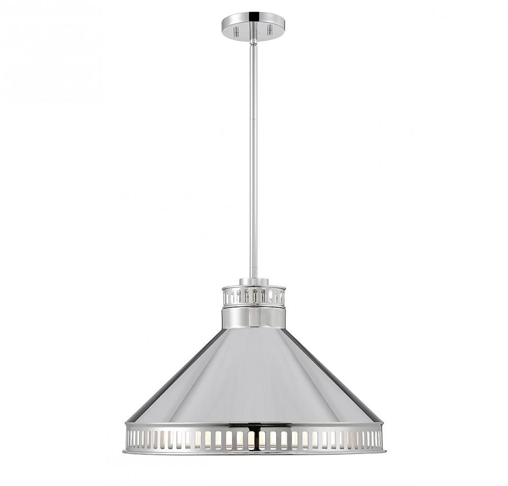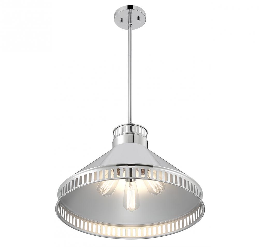 Laser-cut detailing on the metal shade of this Savoy House Seagram 3-light pendant brings a thoughtful touch of intrigue to this industrial look. Finished in polished nickel. Seagram is 20" in width and has an adjustable height ranging from 14.5" to 68". Comes with four 12" downrods and one 6" downrod. It uses 3 standard size bulbs of up to 60 watts per bulb (bulbs not included).