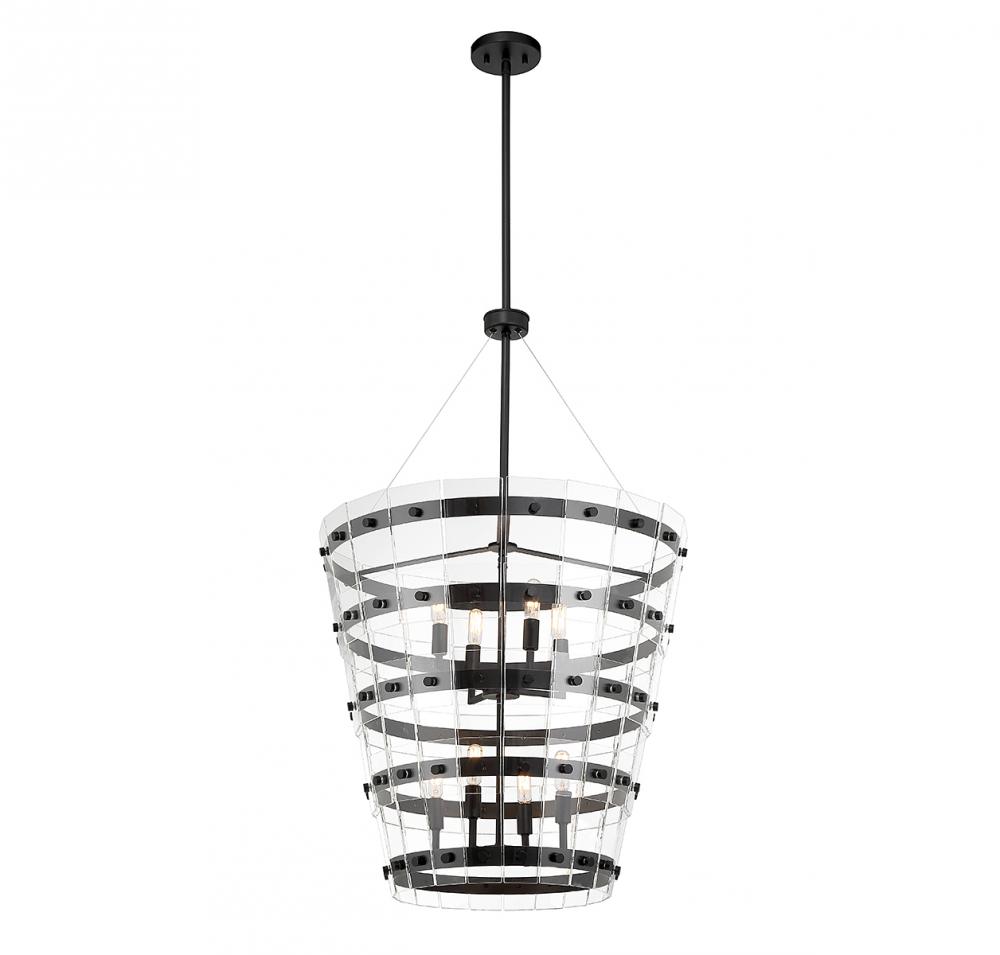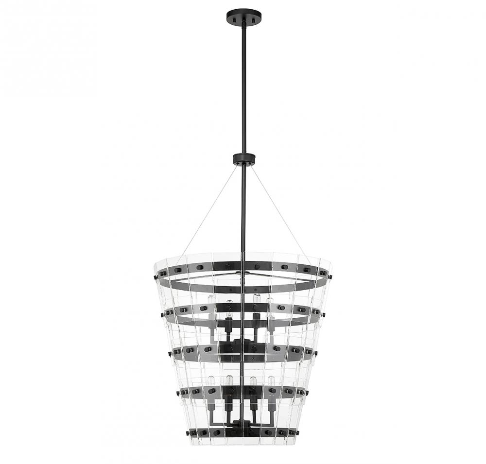 This Savoy House Ventari 8-light pendant is beautifully elegant in its simplicity. Its structure is adorned with slats of clear glass, finished in matte black and appears to be suspended in midair. Ventari is 25" in width and has an adjustable height ranging from 41.5" to 95". Comes with four 12" downrods and one 6" downrod. It uses 8 candelabra size bulbs of up to 60 watts per bulb (bulbs not included).