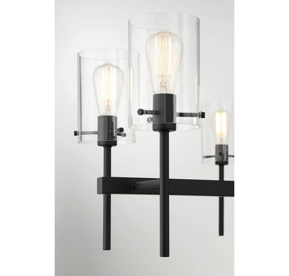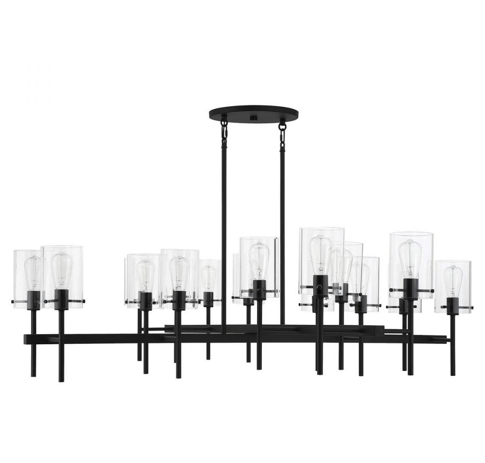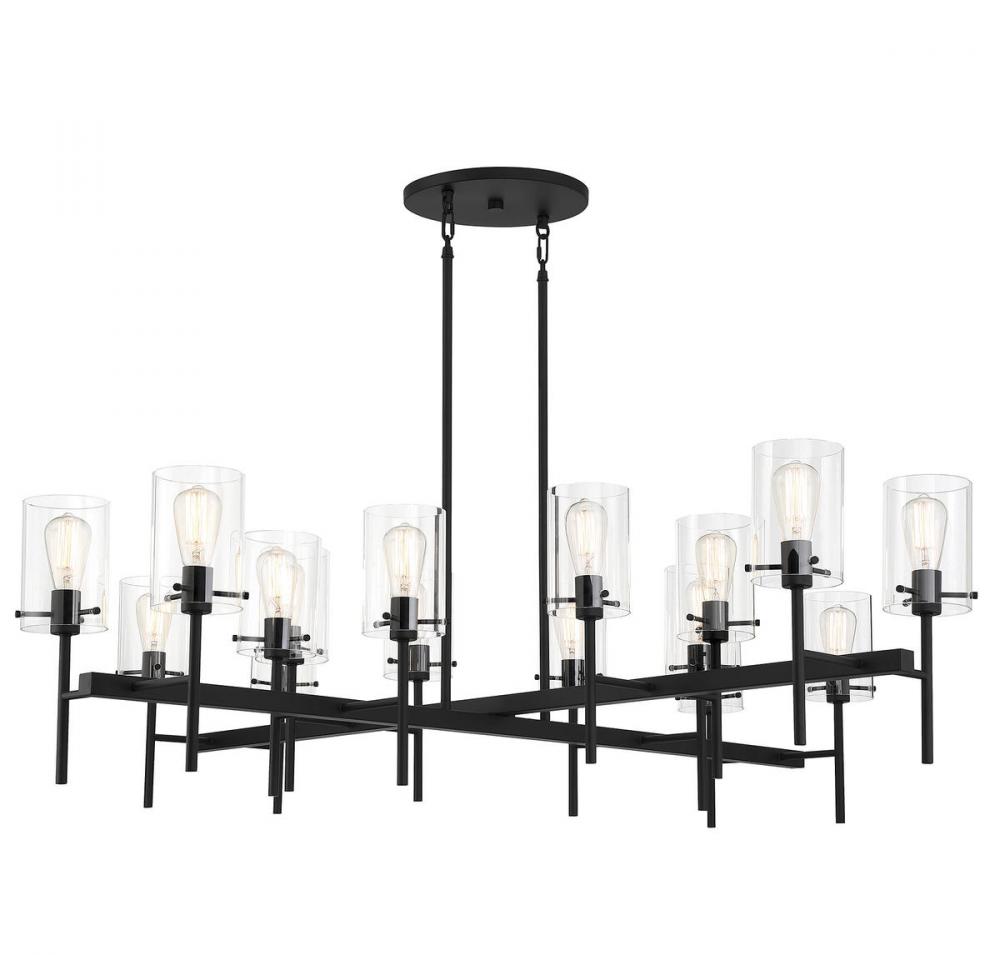 Spanning five feet in width, the Savoy House Vista chandelier makes a grand statement for grand rooms. Sixteen lights inside clear glass shades are arranged on two crisscrossing arms finished in matte black. Vista has an adjustable height ranging from 21.5" to 67.5" and is 60" wide. It uses sixteen standard size bulbs of up to 60 watts per bulb. Comes with eight 12" downrods and two 6" downrods, plus 80" of cord.