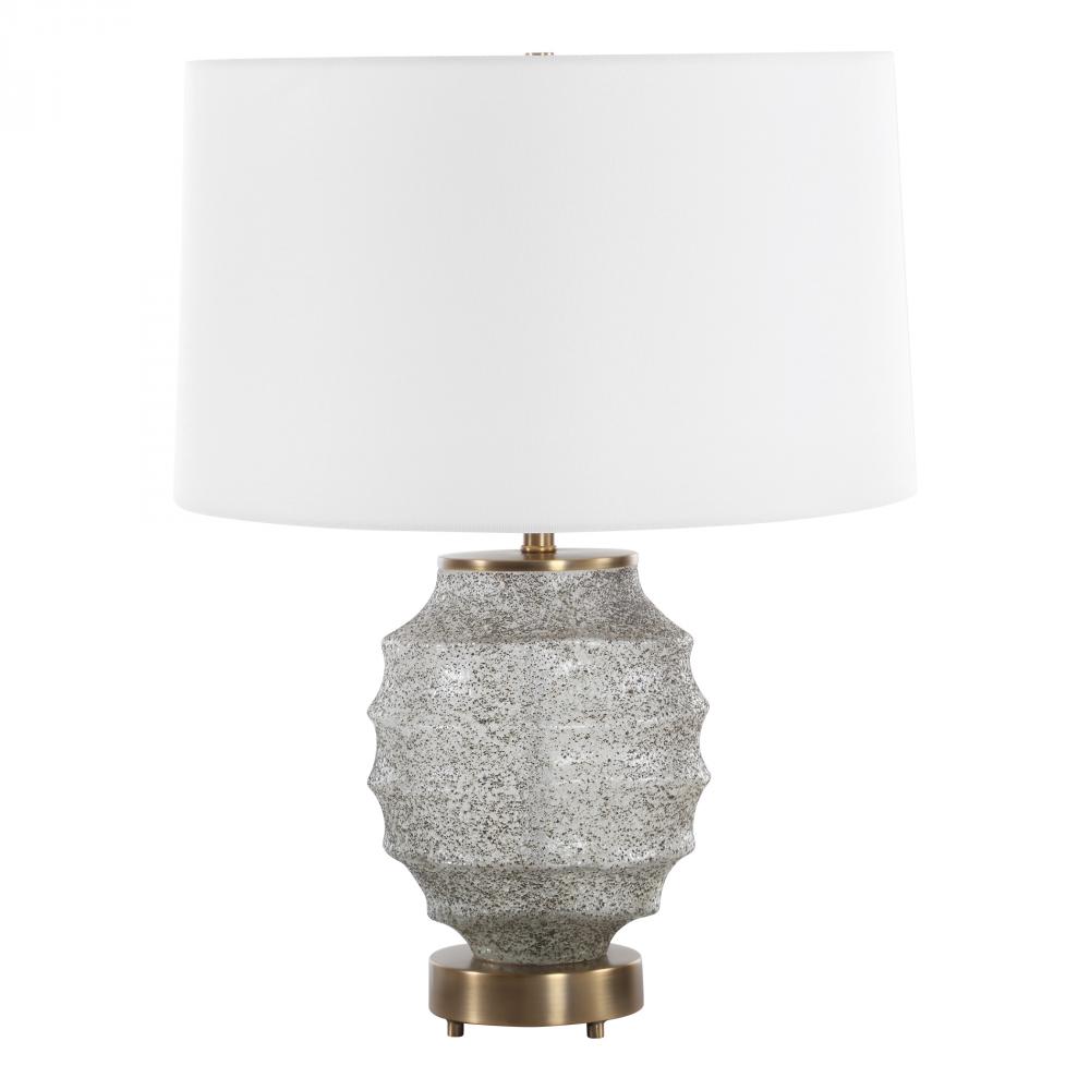 The Acosta Table Lamp Offers A Unique And Stylish Lighting Option Crafted From Textured Glass. Its Ribbed Glass Base In Tones Of Dark Bronze, Rust Brown And Frosted White Offers A Rustic Yet Modern Appeal And Is Accented With Antiqued Brass Plated Details. The Slightly Tapered Round Hardback Shade Is Covered In A White Linen Fabric.