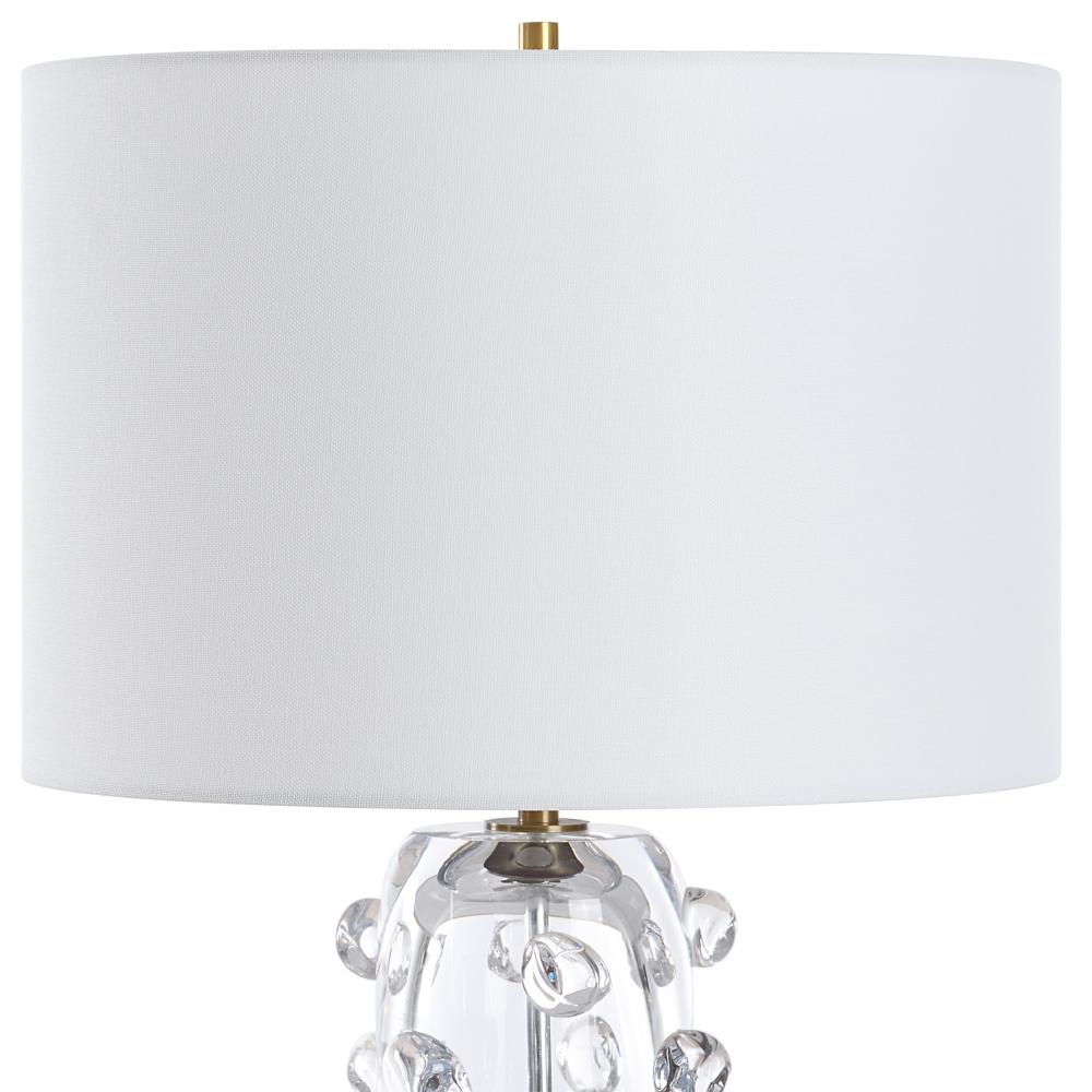 The Aura Table Lamp Features A Clear Glass Base Adorned With Organic Glass Spheres, Set Atop A Plated Brushed Brass Foot. A Round Drum Hardback Shade In A Crisp White Linen Fabric Completes The Piece.