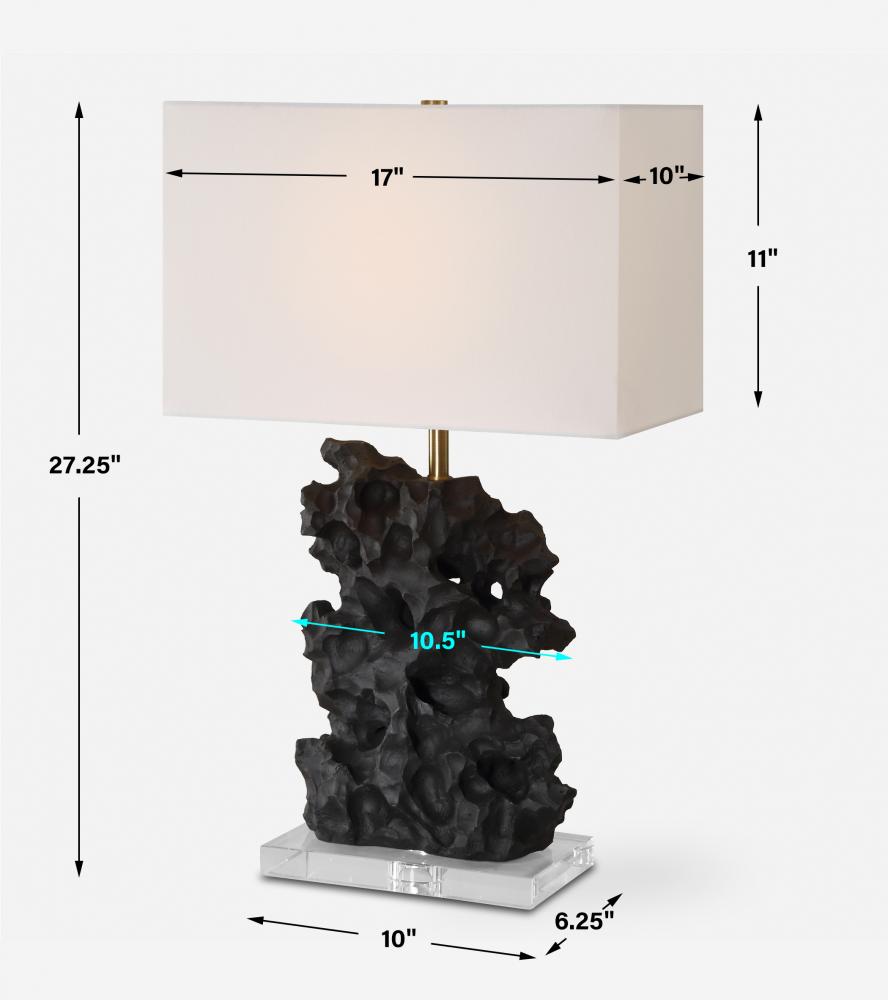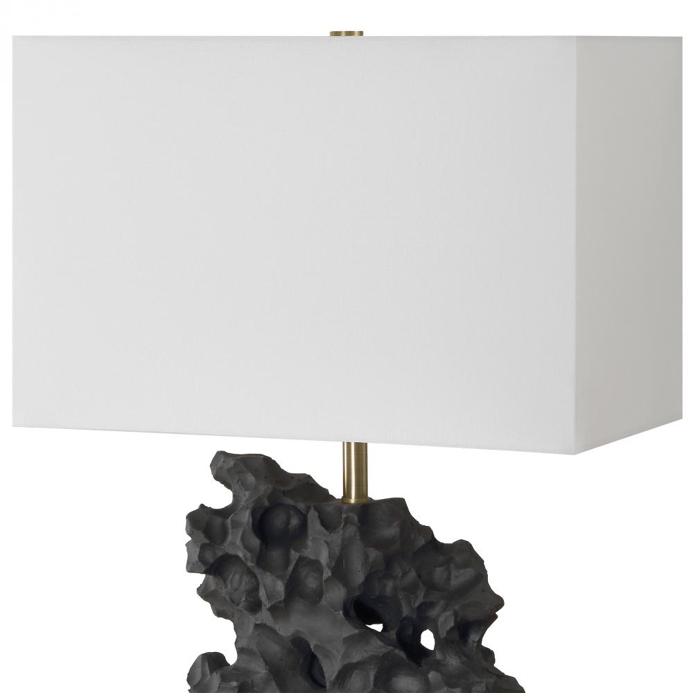 Crafted From A Black Man-made Stone, This Unique Table Lamp Replicates A Rock Sculpture That Boasts Heavy Texture With Distinctive Holes, Displayed Atop A Thick Crystal Base With Plated Antique Brass Hardware. The Rectangle Drum Shade Is Covered In A Crisp White Linen Fabric.