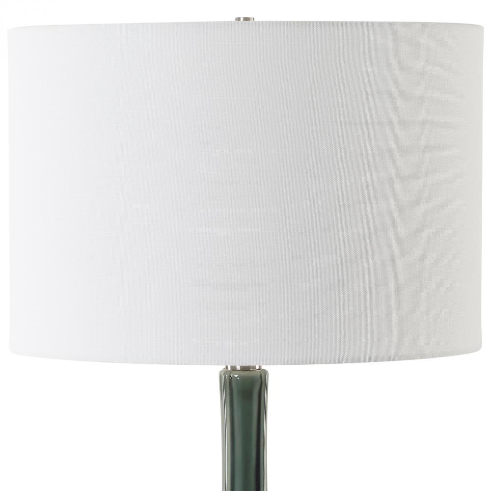 This Ceramic Fluted Base Is Adorned In A Hunter Green Crackled Glaze. This Sophisticated Table Lamp Is Further Enhanced By A Thick Crystal Foot And Plated Brushed Nickel Hardware, Bringing A Touch Of Luxury And Refined Taste To Any Room. The Round Drum Hardback Shade Is Made In A Casual White Linen Fabric.
