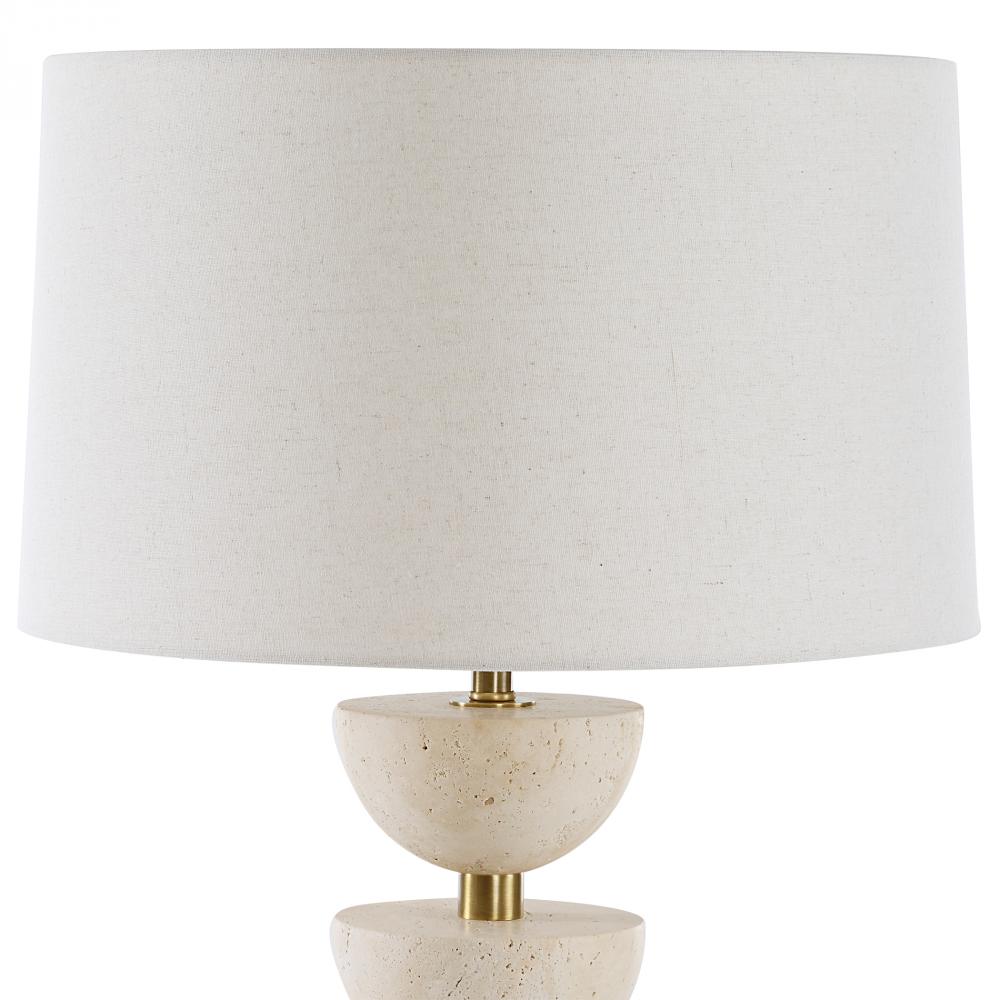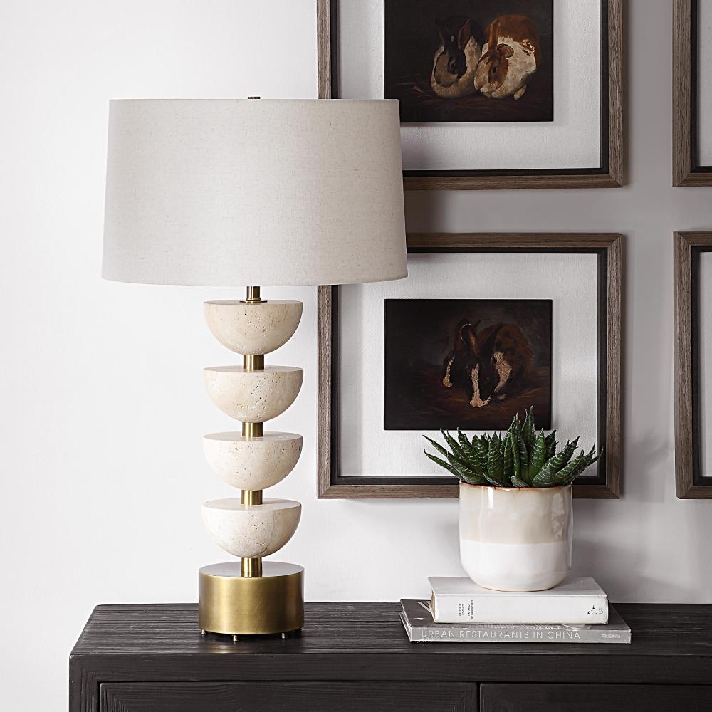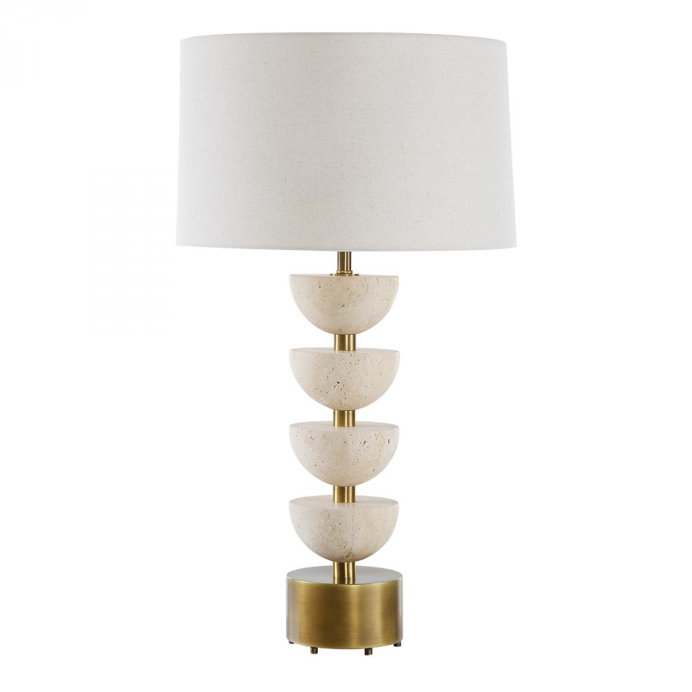 The Meridian Table Lamp Features Stacked Travertine Half-spheres On A Central Plated Brass Base With A Matching Foot. The Slightly Tapered Round Hardback Shade Is Finished In An Off-white Linen Fabric With Light Slubbing.