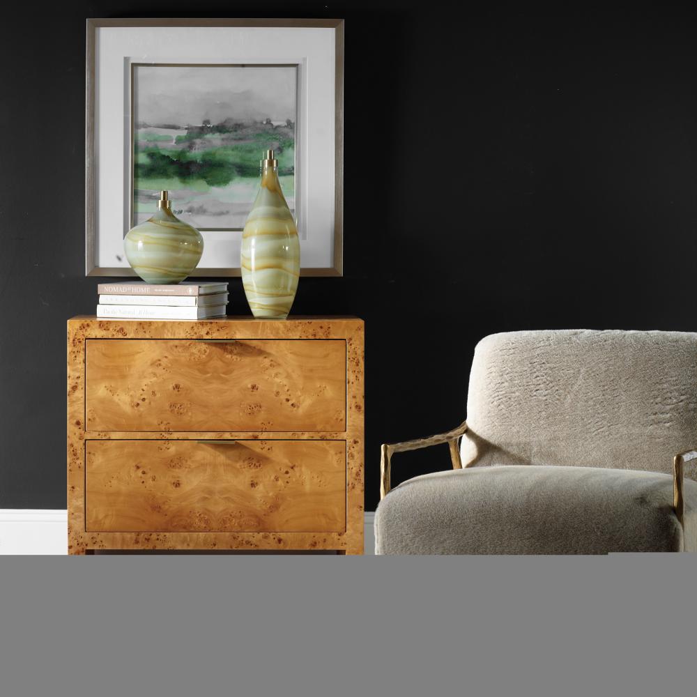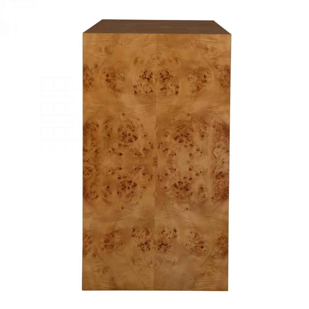 With A Natural Poplar Burl Finish, This Accent Chest Showcases Deep Swirls Inside The Chest's Natural Grains. This Functional Storage Piece Includes Two Large Drawers Illuminating Its Geometric Accents, Features, And Warm Tones.