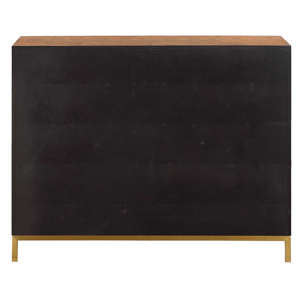 This 2 Door Cabinet Is Meticulously Crafted With A Rich Burl Veneer, Showcasing A Captivating Geometric Square Pattern That Adds Depth To Its Surface. The Cabinet Is Framed By Gold Finished Metal Legs And Coordinating Hardware That Enhances Its Luxurious Appeal.