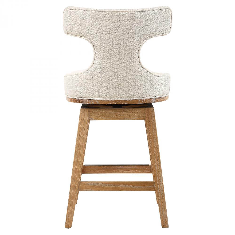 A Modern Take On The Classic Klismos Design, This Counter Stool Is Reminiscent Of Mid-century Style. Upholstered In A Textured Off-white Fabric With A Swivel Return Seat With A Toxin-free, Eco Friendly Treatment To Help Resist Water Based Stains. Paired With Naturally Finished Oak Legs With A Bronze Kickplate. Seat Height Is 26".