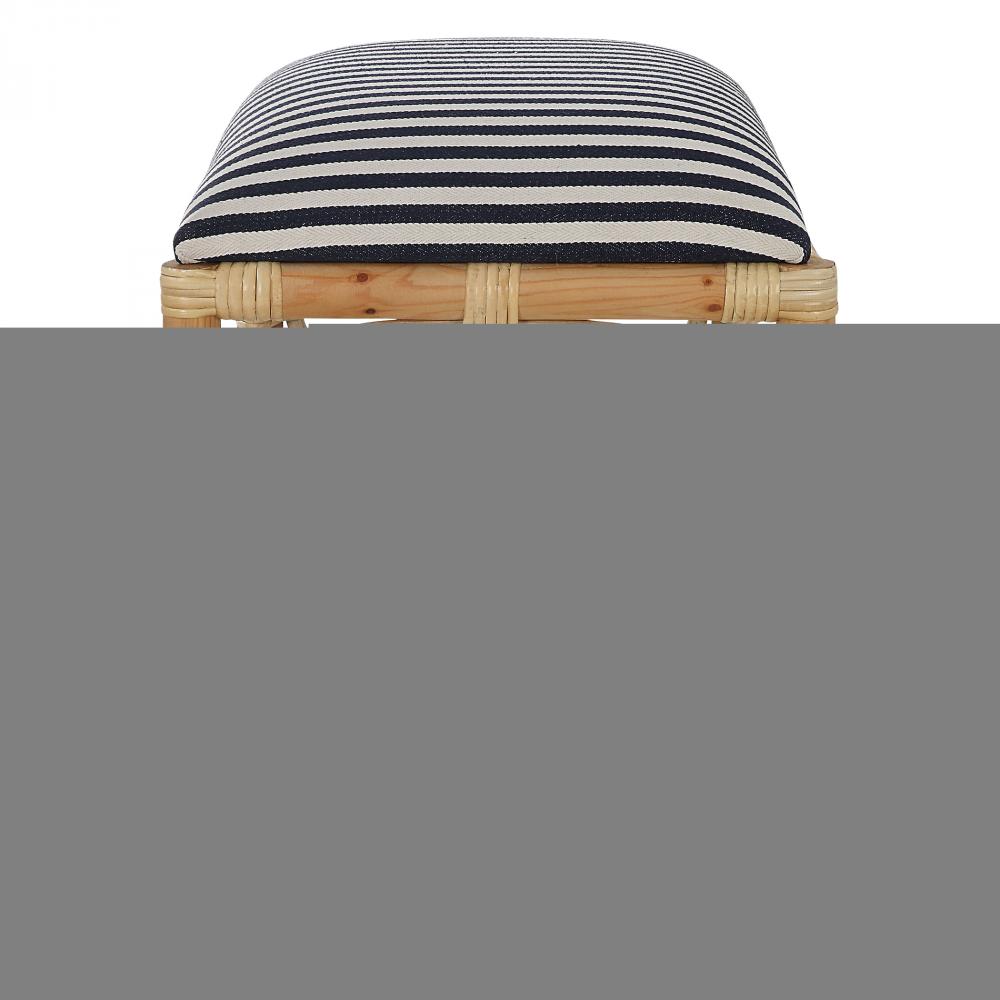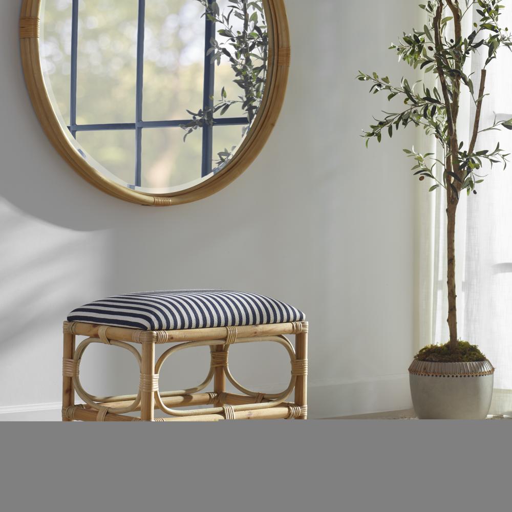 A Refreshing Coastal Accent Featuring A Casual Cotton Blend Navy and White Striped Seat, Over A Naturally Finished Solid Wood Base with Rattan Wrapped Accents. Perfect Doubled Up At The Foot of A Bed or Under A Console Table.