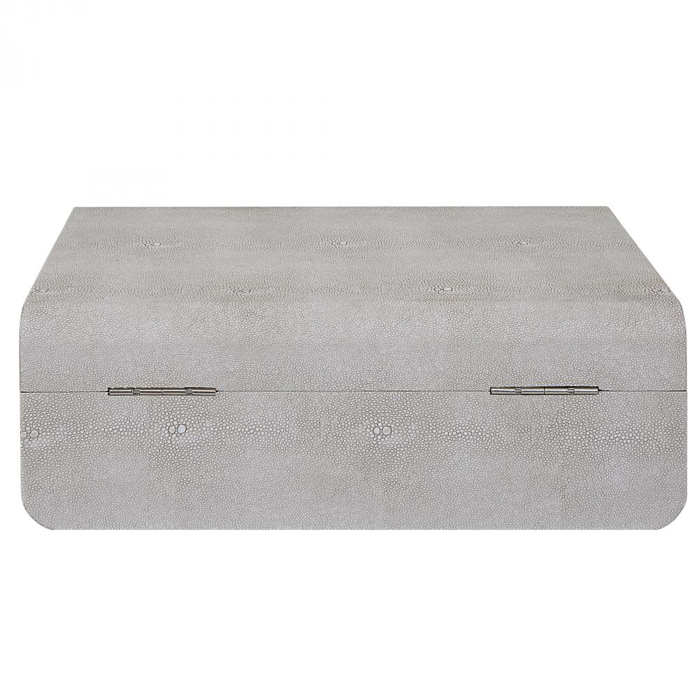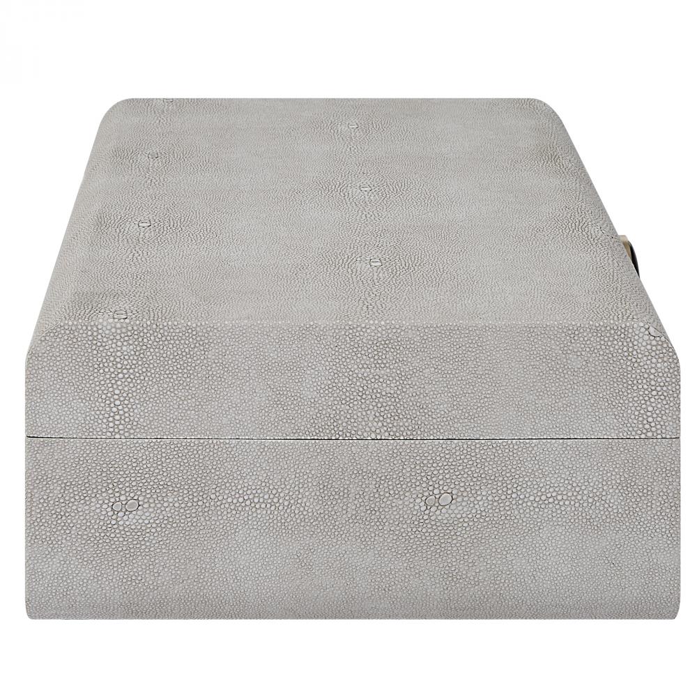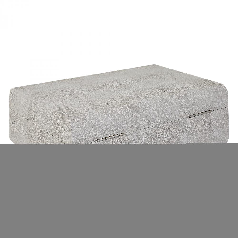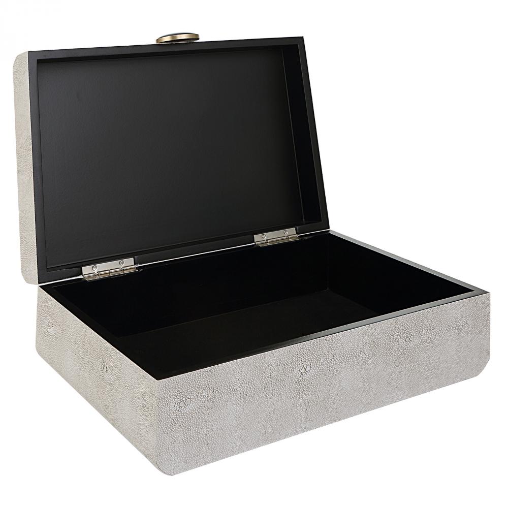 Inspired By The Art Deco Era, This Decorative Box Showcases A Faux White Shagreen Wrapped Exterior Accented By A Brushed Antique Brass and Black Enamel Closure. The Interior is Finished in Matte Black.