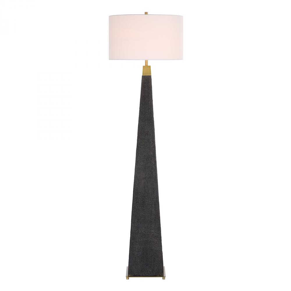 The Lathey Floor Lamp Showcases A Tapered Base With A Burned Wood Look Replicating The Timeless Shou Sugi Ban Technique Of Preserving Wood, Accented With Plated Brass Details. The Round Hardback Drum Shade Is A Casual White Linen Fabric.