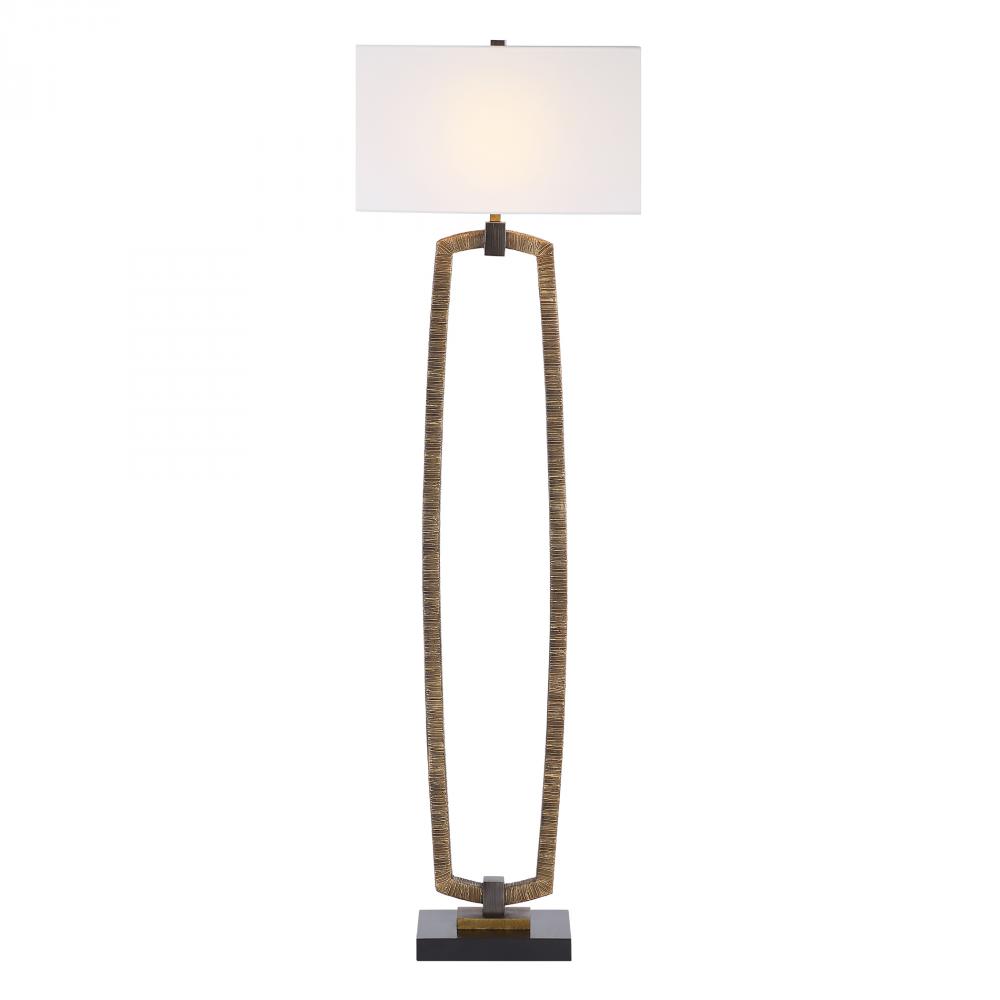 The Relic Floor Lamp Captures Bohemian Charm With Its Deeply Antiqued Gold Finish With Hand-carved Textures Along The Unique Parallel-style Base. It Is Complemented By Dark Bronze Accents And A Black Marble Foot. The Lamp Is Paired With An Oval Hardback White Linen Shade.